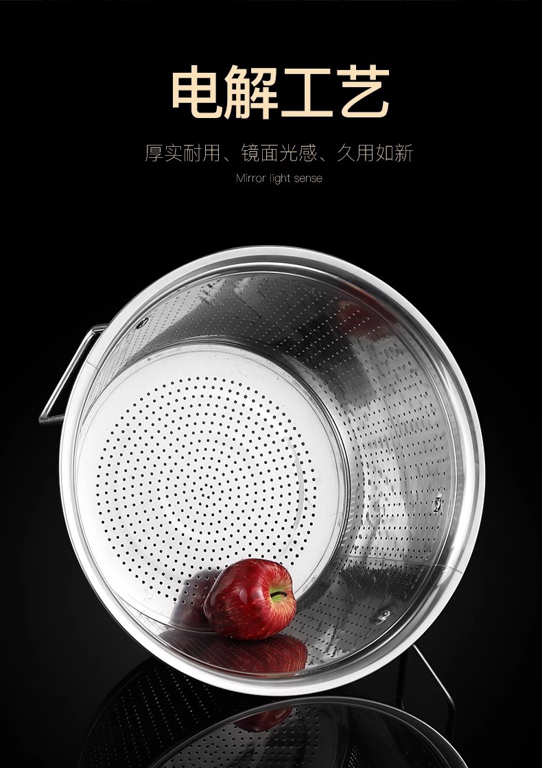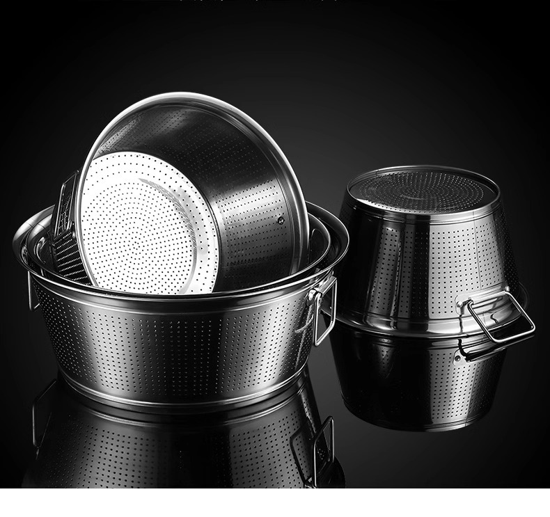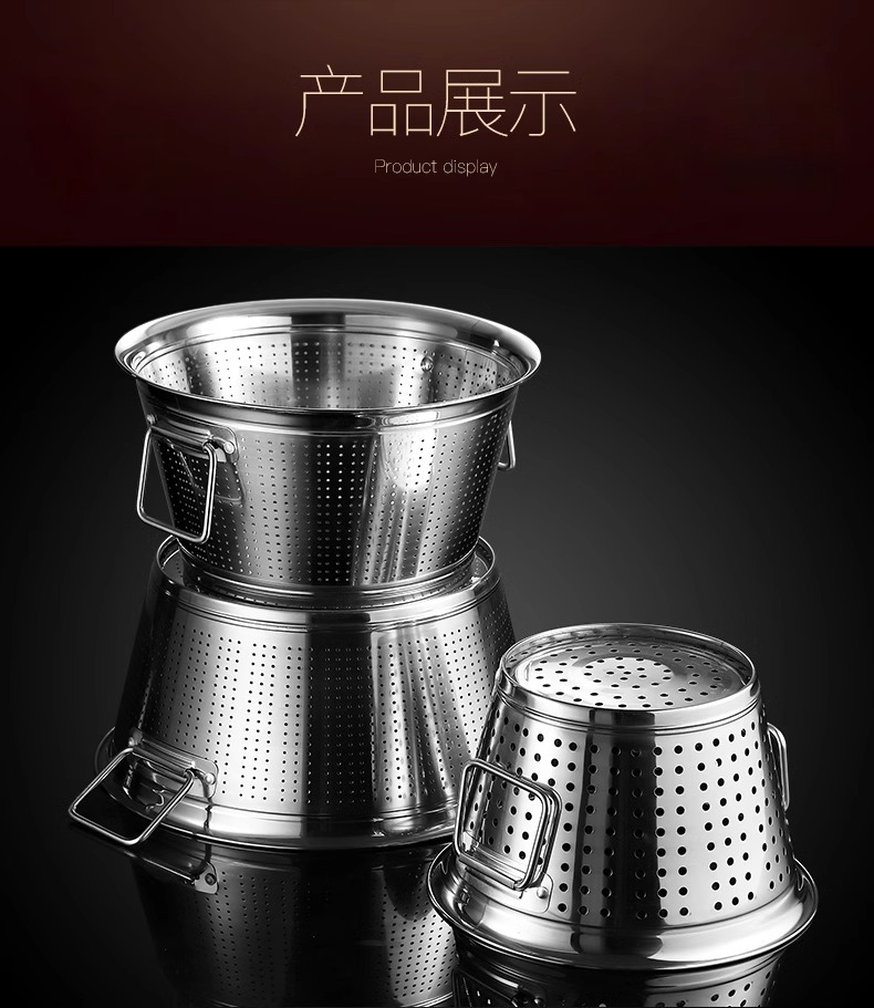 厚い大容量のステンレス製の水たまりのたらいは手を持って野菜を洗う桶の業務用台所の米を洗うふるいの水たまりのかごを洗います。