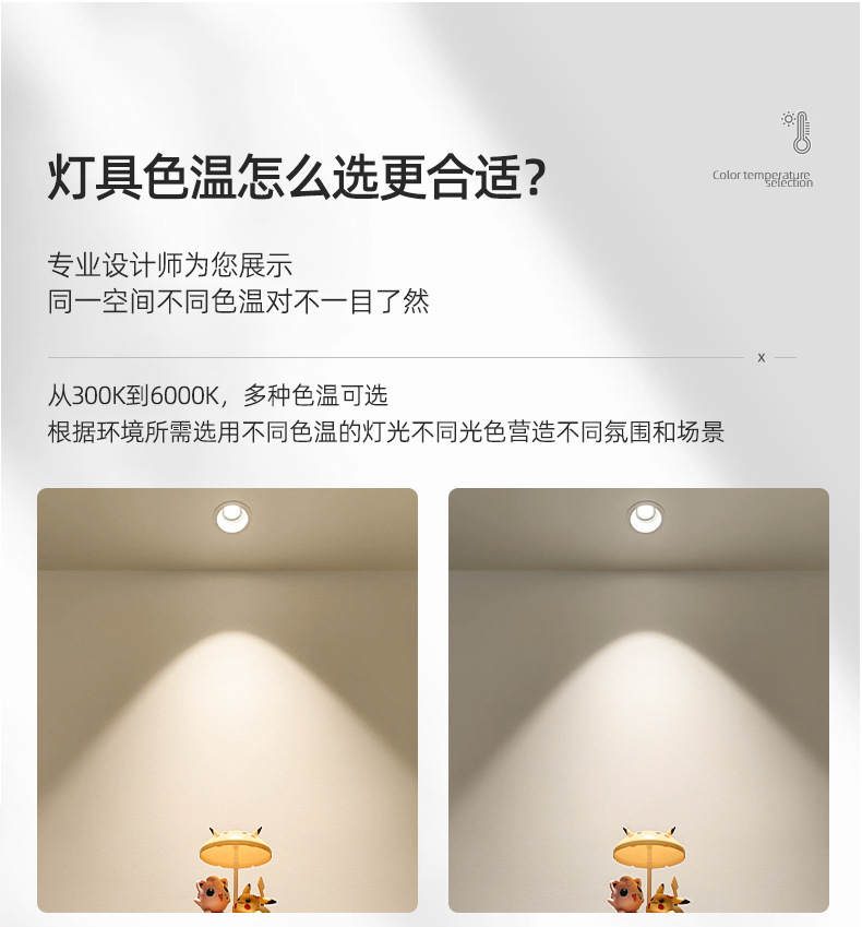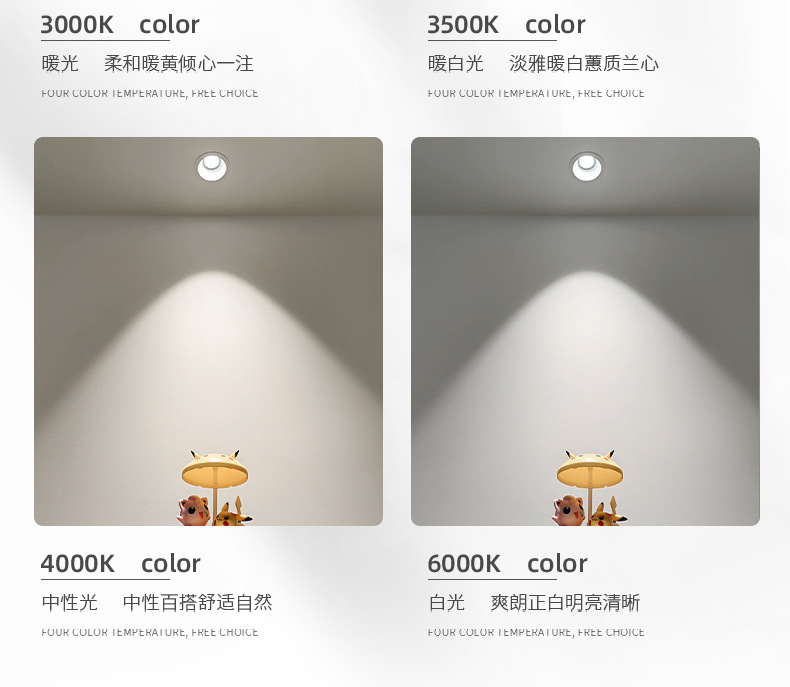 3000K(暖かい光),3500K (温白色光),4000K (昼光色),6000K(白色光),3色ライト(3000K/4000K/6000K),調光とカラーマッチング 3000-6000K