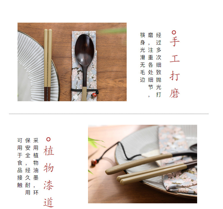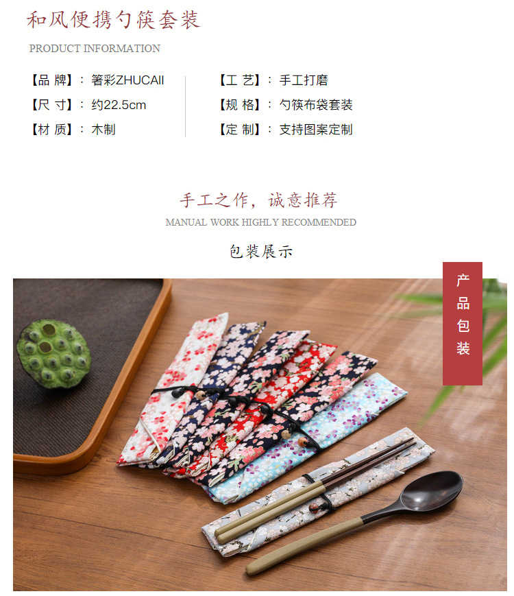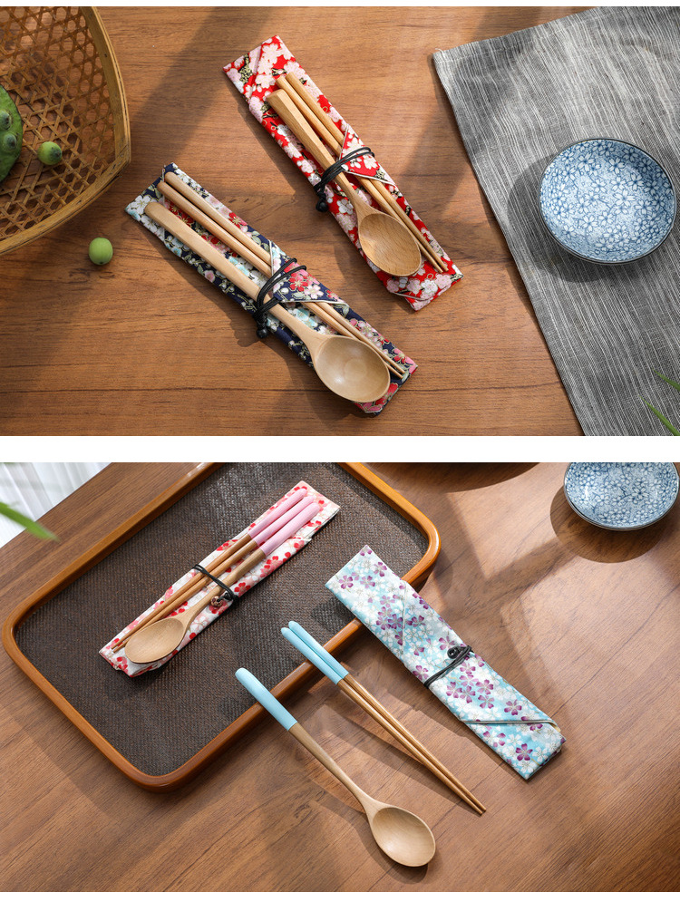 箸とスプーンの携帯セット、木製箸2本セット、サラリーマン向け旅行用携帯食器、和風布袋付きギフト