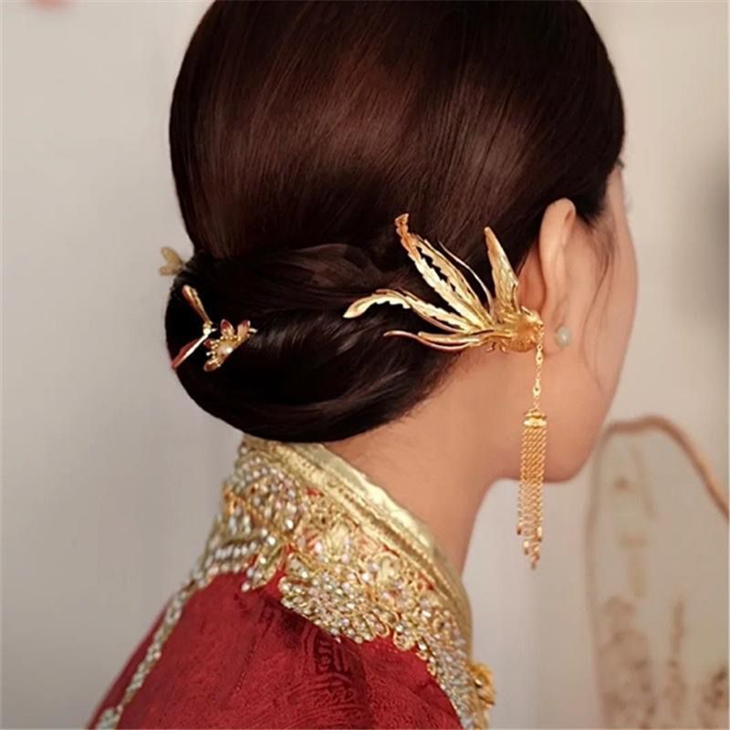 民族風の新婦の頭は金色の鳳凰を飾って、金色の髪を流します。