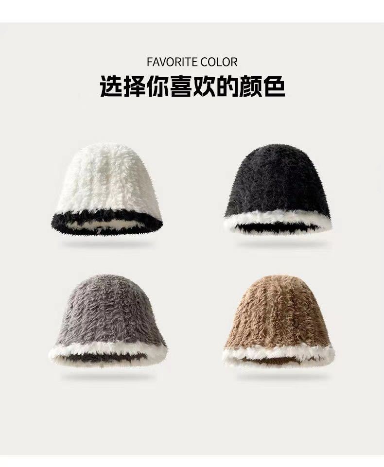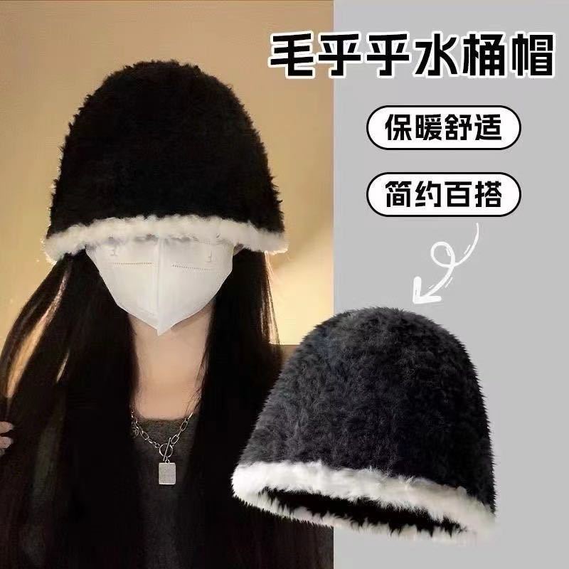 新款日系学生大头围秋冬帽子女百搭毛绒拼接针织保暖毛线渔夫帽子