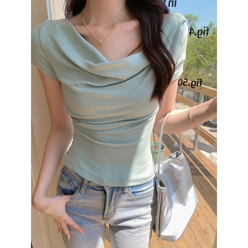 国境を越えたヨーロッパとアメリカのアメリカン湯たんぽBMスタイルVネックスキニーTシャツ女性用2025夏ショートスリム半袖レディーススポット