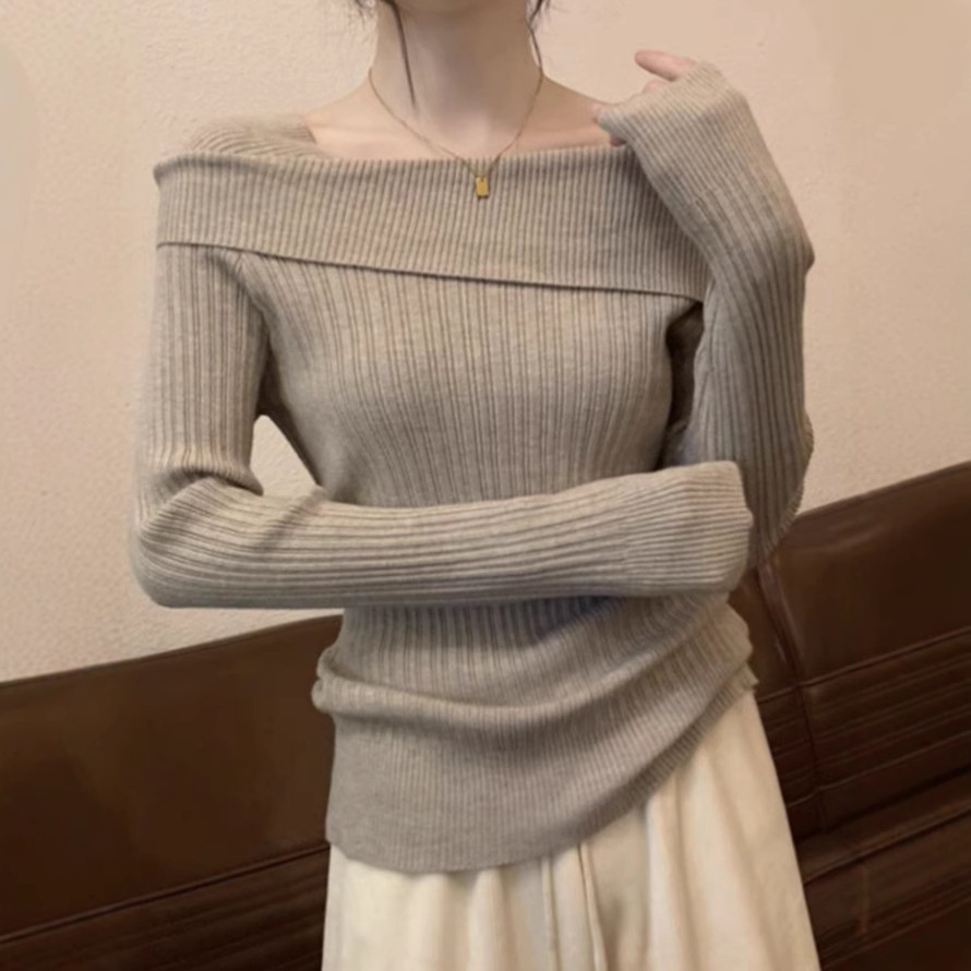 一字の肩のニットの底のセーターの女性の春と秋冬の不規則な中にフランス式の高い腰のまっすぐな肩の長袖の上着を掛けます。
