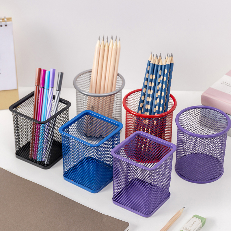 クリエイティブカラー丸型角メッシュ金属多機能ペンホルダー韓国ファッションデスクトップ事務用品収納置物