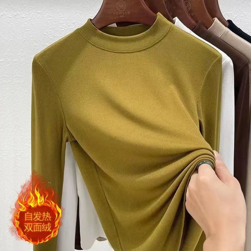 毛を磨いてベルベットの半高襟がキラキラ光る長袖tシャツの女性2024の新しい洋気の中に保温シャツの上着を着ている