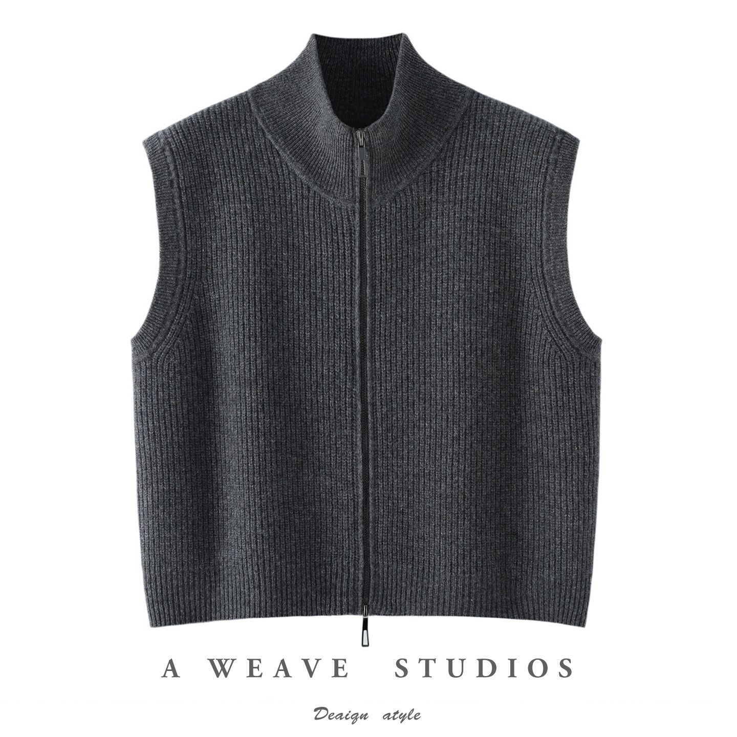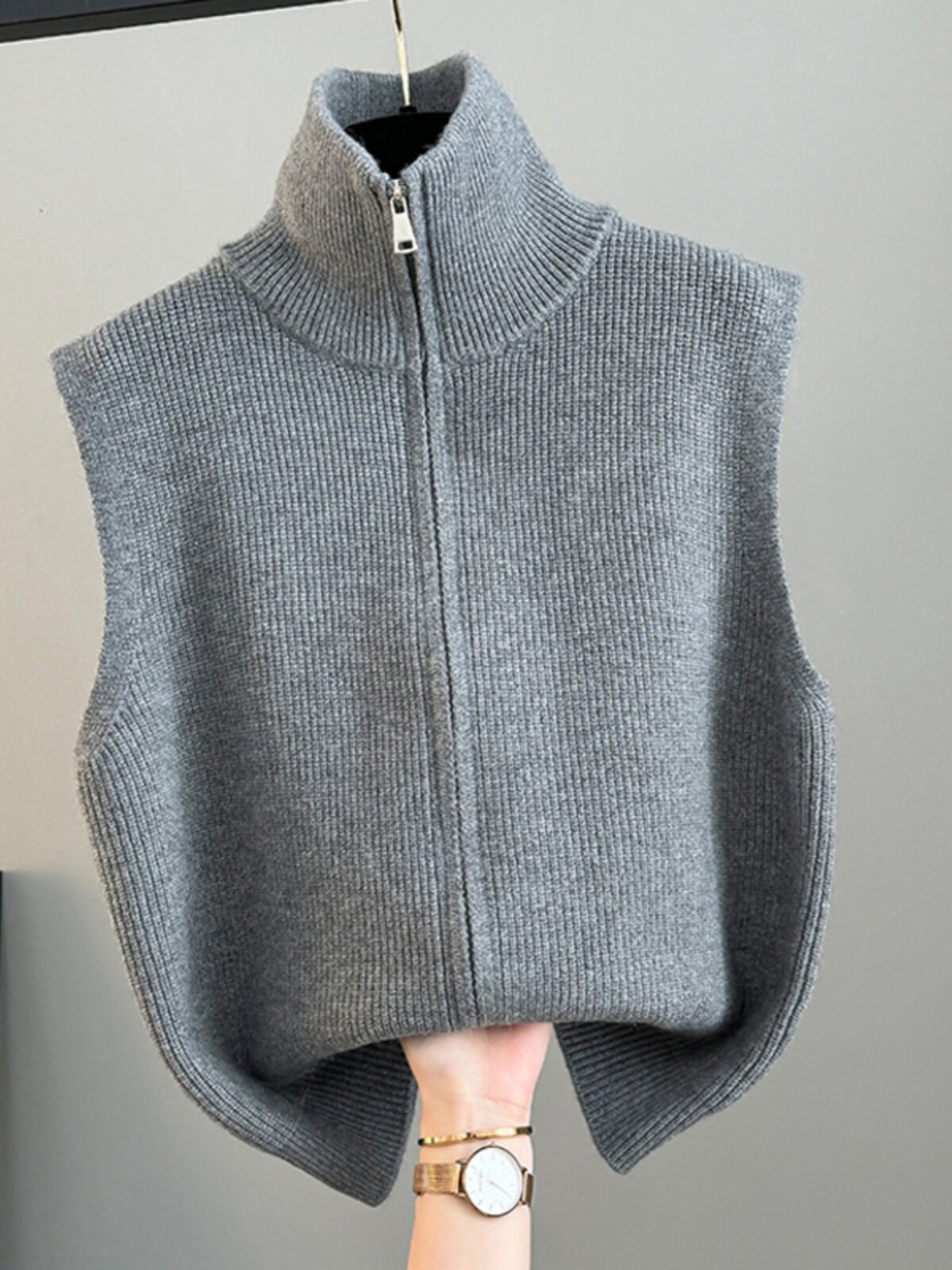 2025年秋冬新款纯羊毛半高领针织马甲开衫双拉链纯色保暖无袖上衣