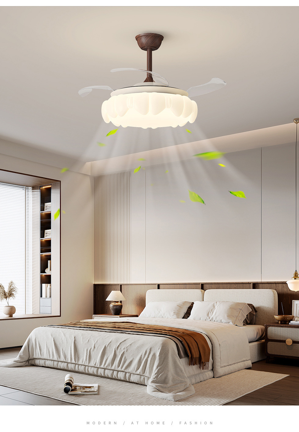 厳選されたレトロなウォールナットカラーファンランプ、ハイエンドフラワーベッドルームソフトウィンドシーリングファンランプ、インビジブルレストランファンランプ