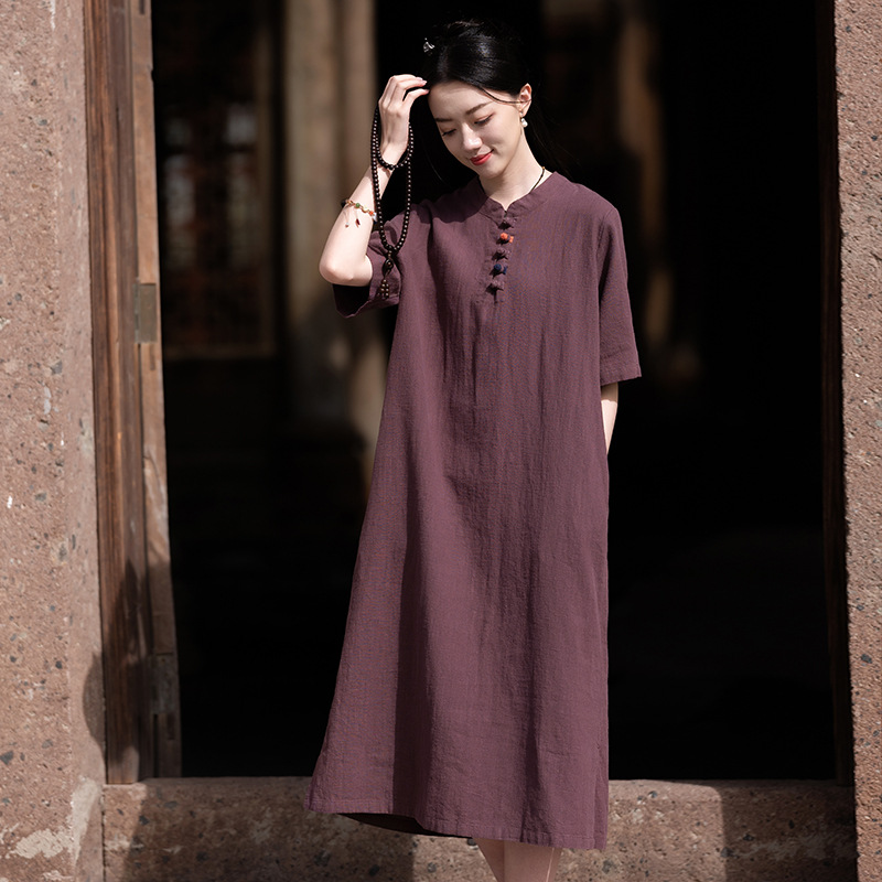 25 綿とリネンの女性の夏の中国風スタンドカラー半袖サンドウォッシュ改良されたチャイナドレスロングスカート女性のローブドレス