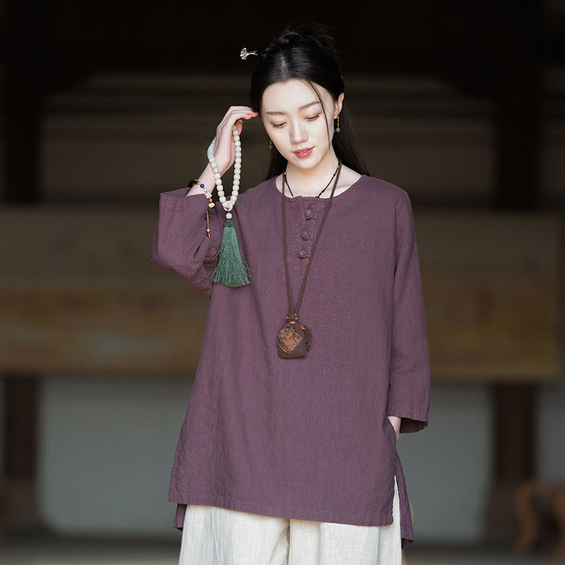 25 秋の綿とリネンの女性の新しいレトロな中国風のラウンドネックステッチボタンシャツトップ女性の禅瞑想ビッグ T