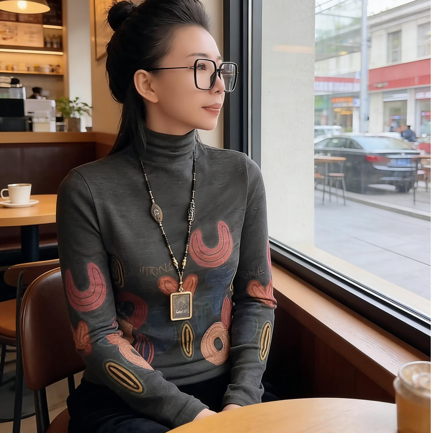 秋冬新款时尚半高领印花长袖保暖衫遮肚减龄大码妈妈装气质上衣