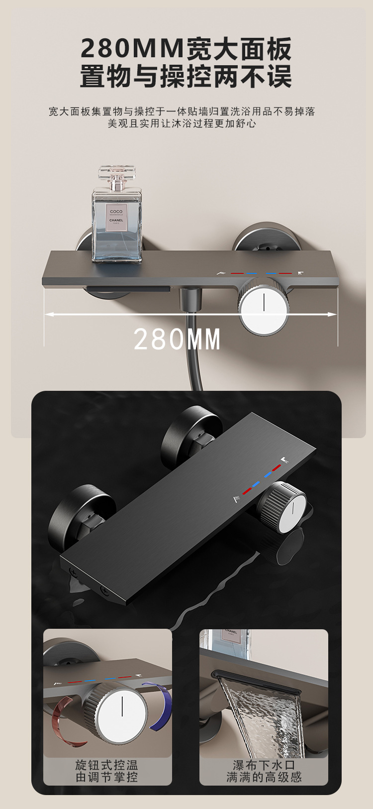 バスルームのシャワーの花が滝をこぼして出てくるピアノの暗い服装の花がデジタル表示の恒温機能の銃の灰色のシャワーの花がセットをこぼします。