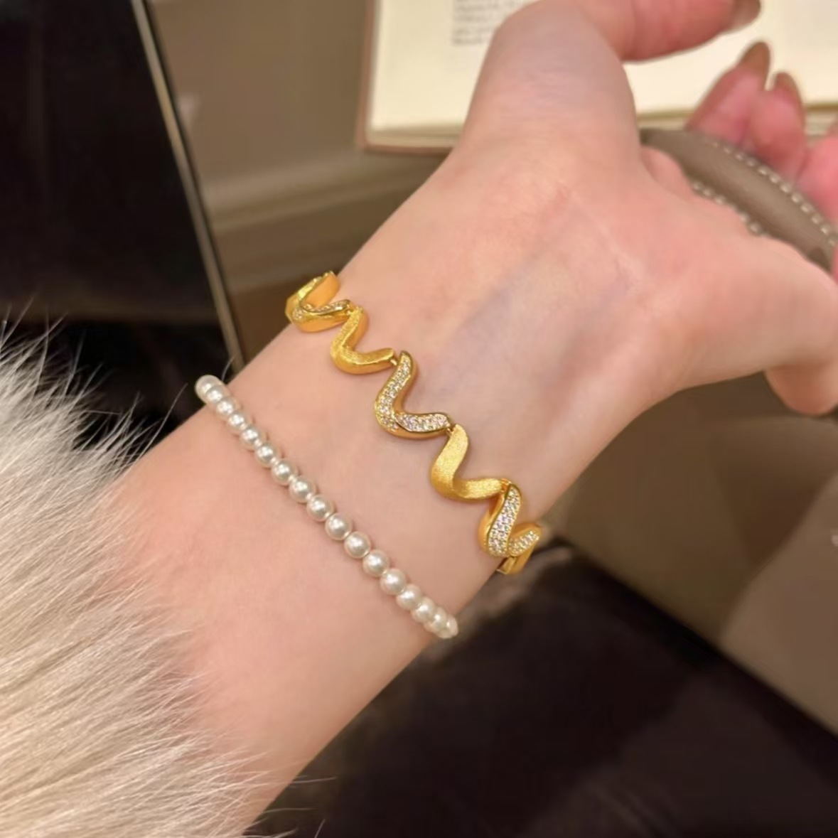 沙金拉糸はダイヤモンドの波のブレスレットを入れて、黄金色の水の波紋のブレスレットは軽くて豪華なファッションはダイヤモンドの絹織物を入れてブレスレットをつなぎます。
