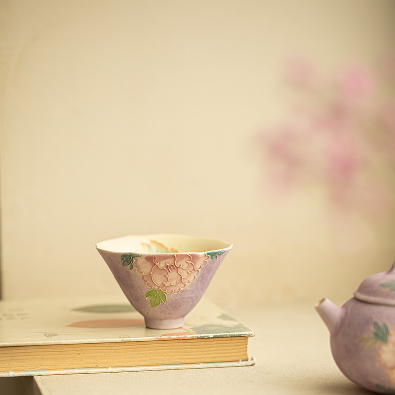 景德镇新中式手绘牡丹茶杯斗笠杯主人杯精致女生陶瓷茶具功夫茶杯