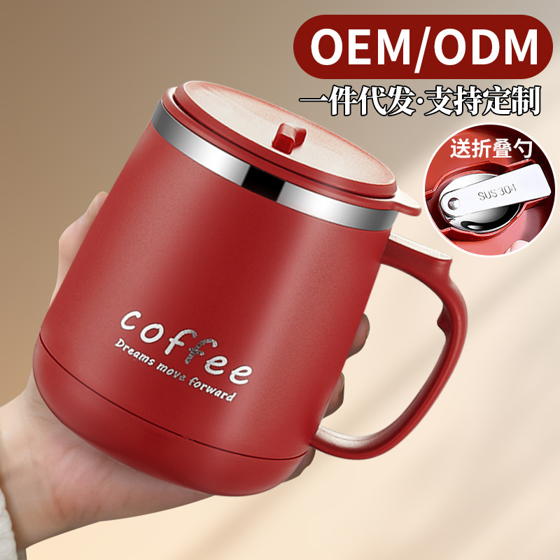 304ステンレスマグカップ携帯コーヒーカップ保温カップ家庭用赤朝食カップスプーン付きオフィスカップ