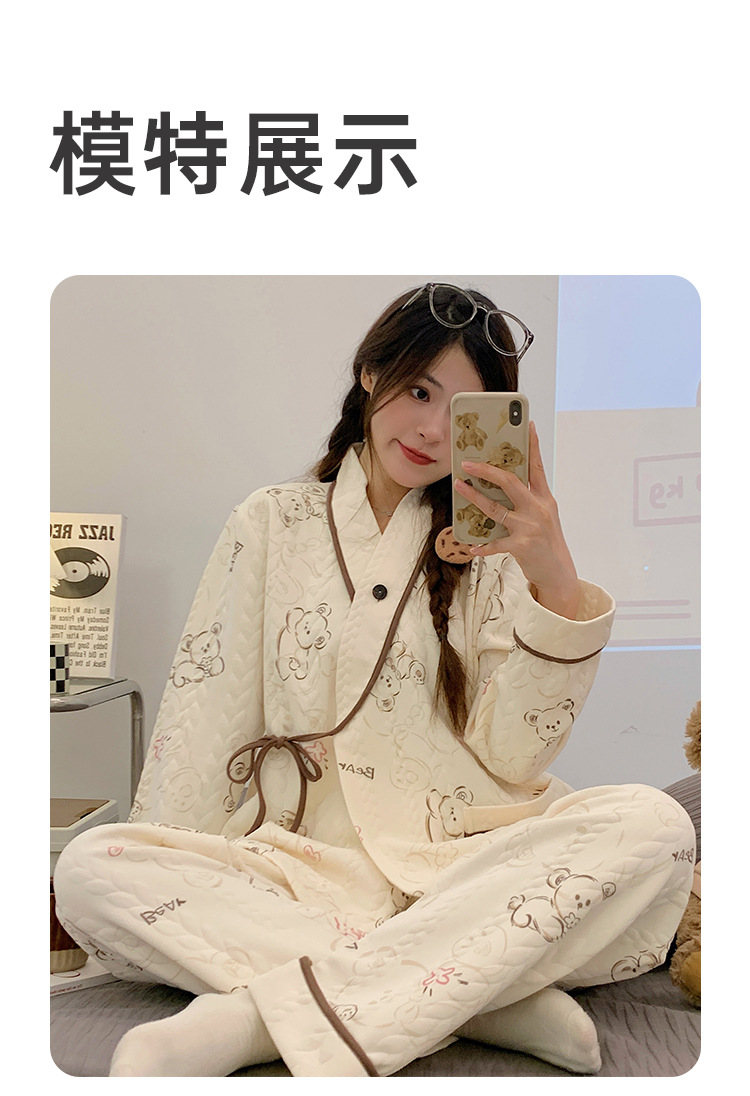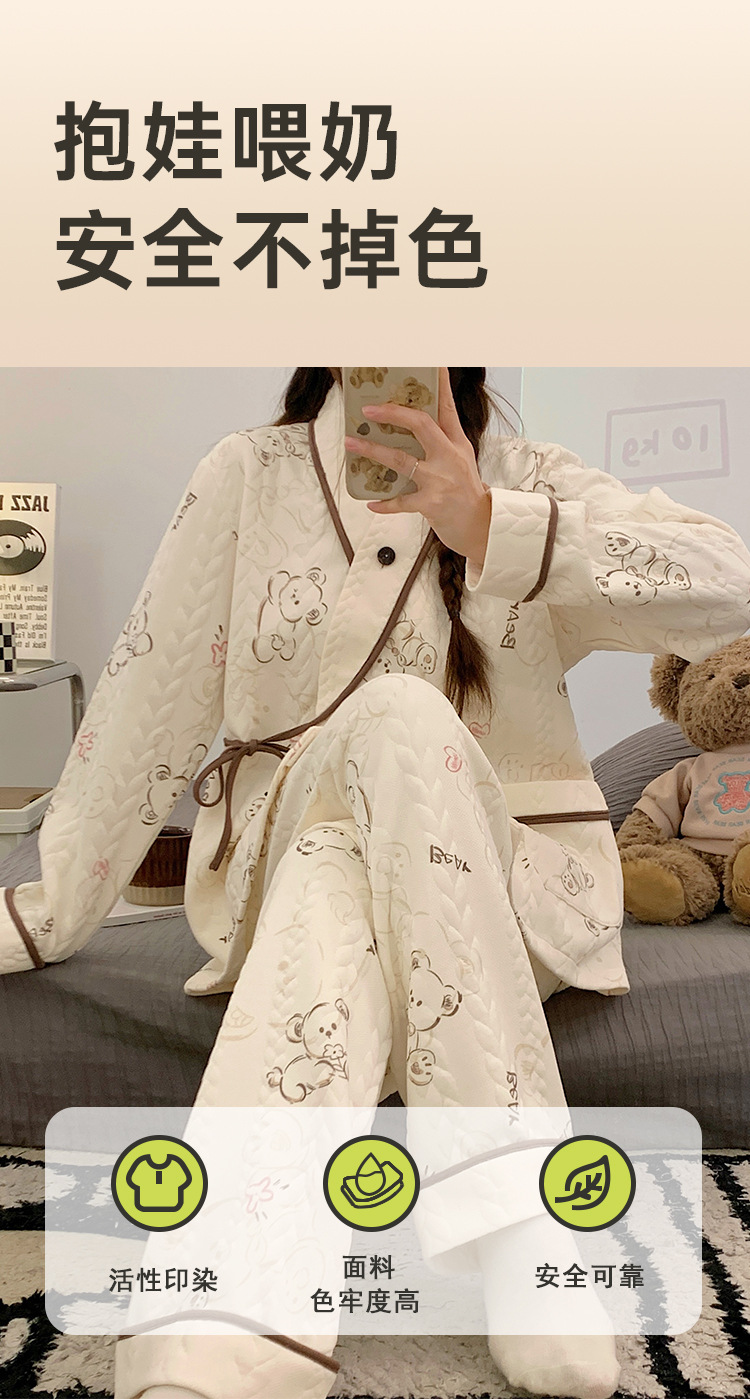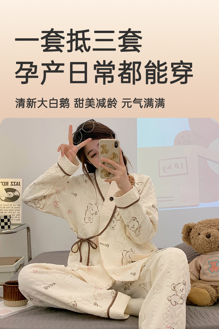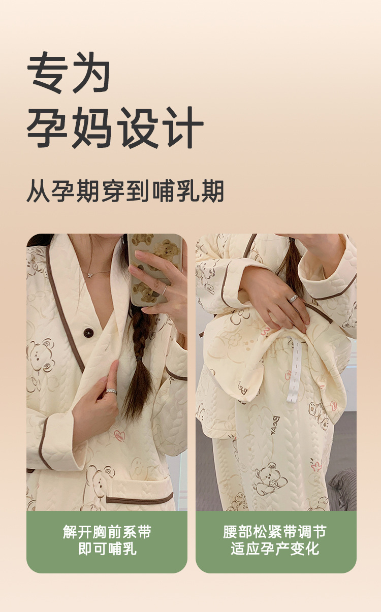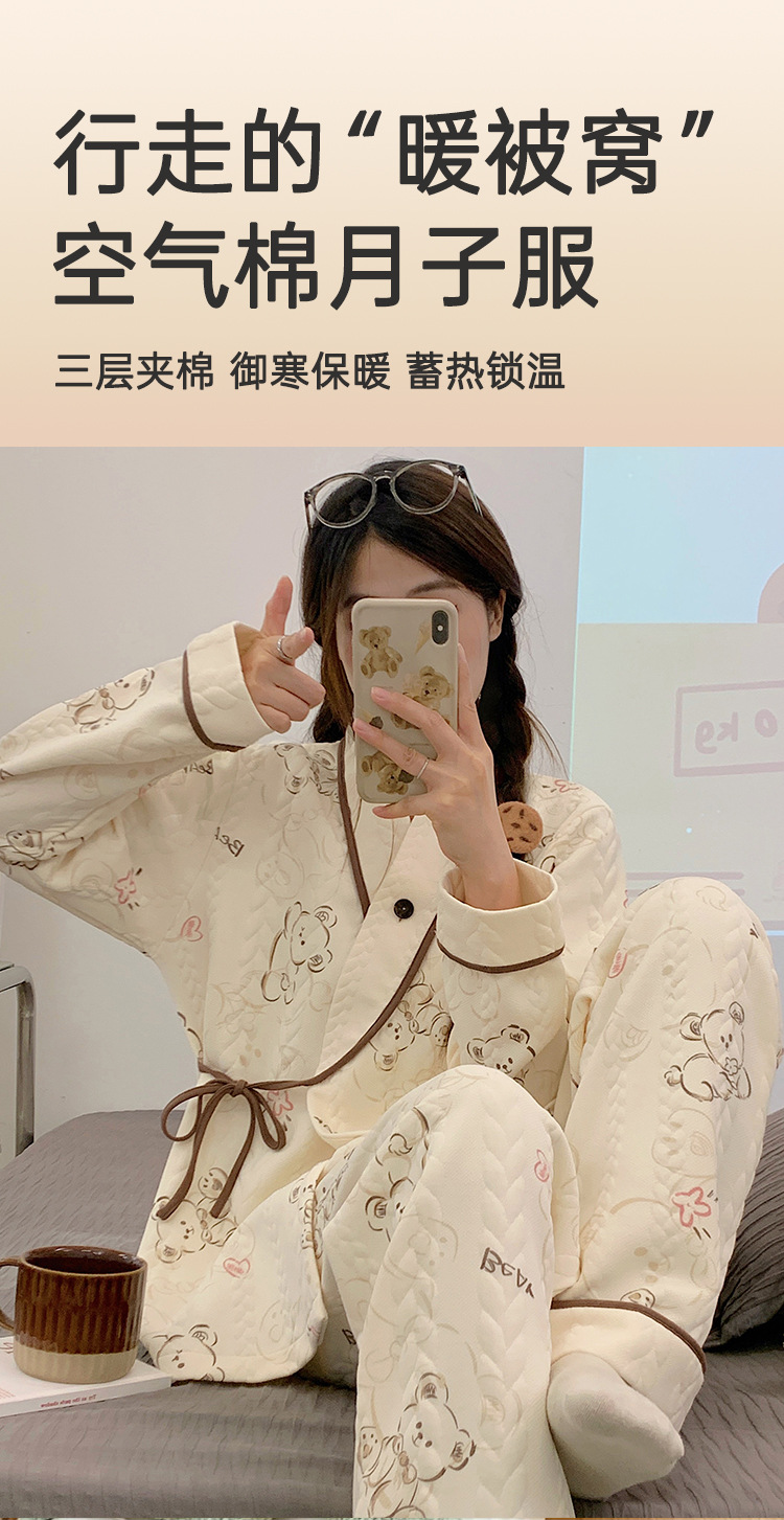 3月子服春秋款空气棉夹棉哺乳睡衣三件套产妇孕妇喂奶待产房家居
