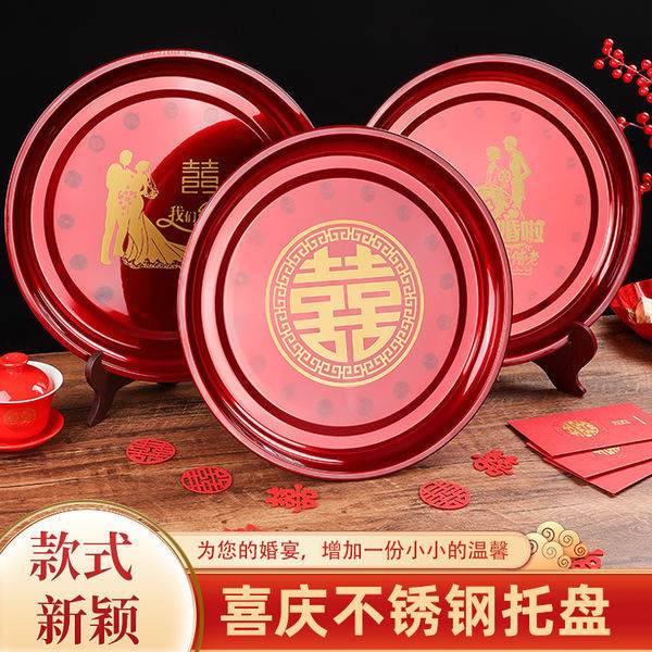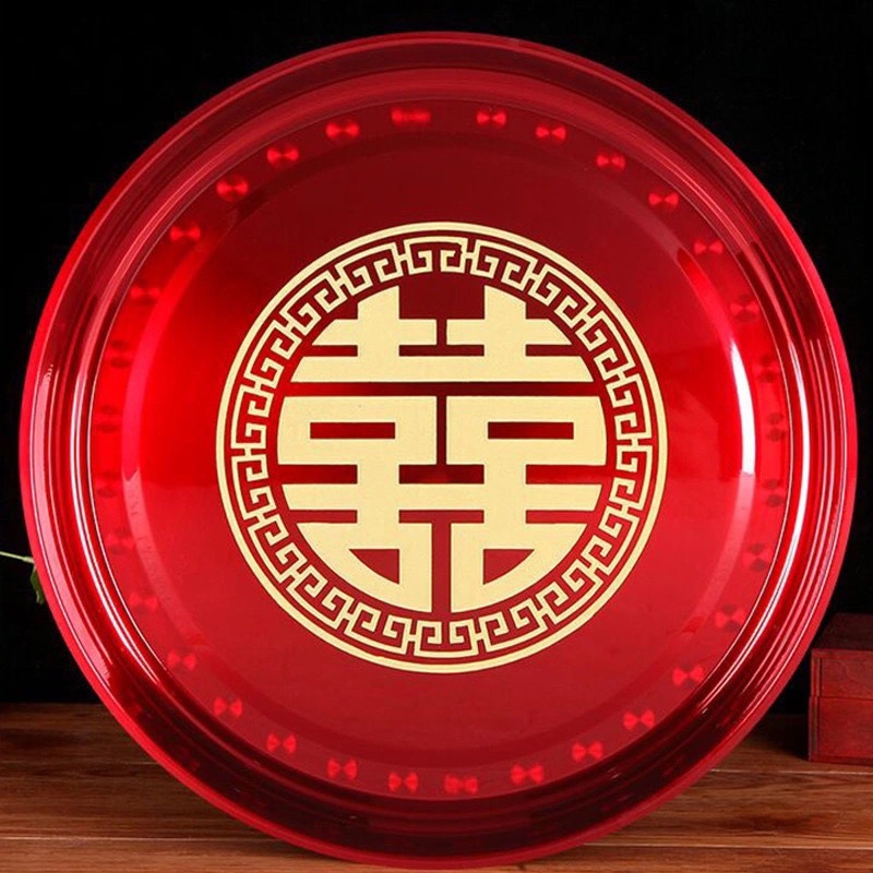 キャンディー皿中国式円形ステンレス茶皿お祝い赤い果物皿花嫁敬茶トレー結婚式喜皿