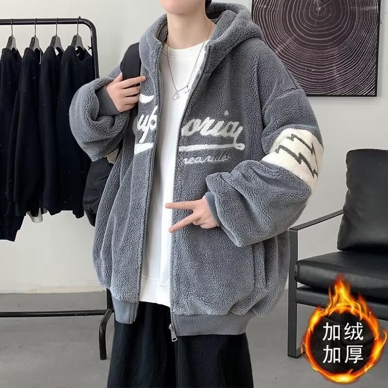 青少年学生の子羊の毛のコートの男性の秋冬の新型の潮とベルベットの厚い保温の色の上着と帽子のシャツ