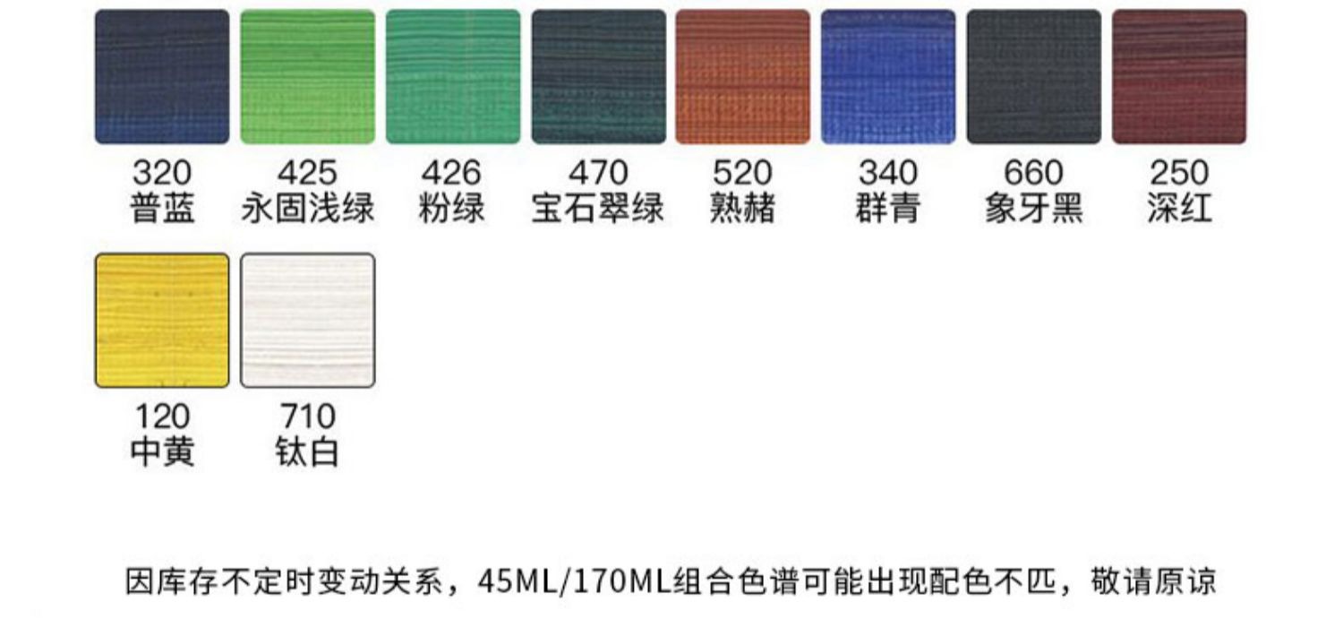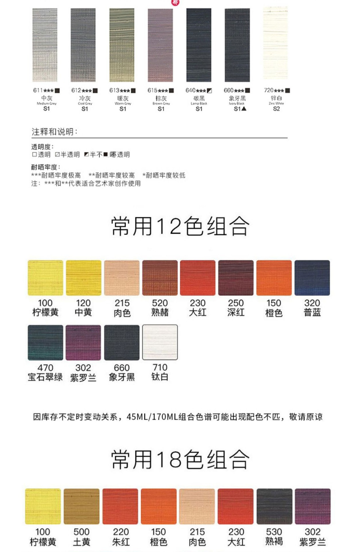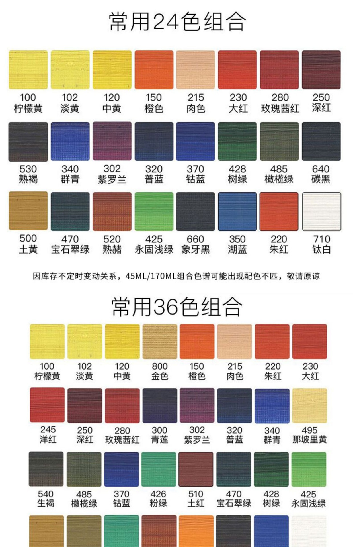 レモンイエロー100,ライトイエロー 102,ミディアムイエロー 120,オレンジ150,ライトクリムゾン 215,バーミリオン 220,ビッグレッド230,マゼンタ 245,クリムゾン250,ローズクリムゾン 280,清蓮 300,バイオレット 302,プーラン 320,チョンチン 340,ナポリイエロー 495,オリーブグリーン 485,コバルトブルー 370,ピンクグリーン 426,ジェムエメラルドグリーン 470,ツリーグリーン 428,永遠ライトグリーン 425,ヴェローナグリーン 450,イエローオレンジ 140,スカイブルー365,亜鉛チタン ホワイト 730,アーシーグリーン 480,カーボンブラック640,ジンクホワイト 720,チタンホワイト710,クイックドライホワイト 740,ジファン110,ダークイエロー 130,ファンダイ ブラウン 550,インディアンレッド 225,ジホン 255,パープル 260,ウルトラマリンパープル 305,プーラン 320,ヤン・チンラン 330,レイクブルー 350,ジラン 355,ミディアムグリーン 430,アーシーイエロー500,シェンフェン 501,アーシーレッド 510,熟した520,調理済みブラウン 530,ストーンブラウン 540,ペイングレー610,ミディアムグレー 611,コールドグレー 612,ウォームグレー 613,ブラウングレー 615,アイボリーブラック660,ゴールデン800,シルバー810