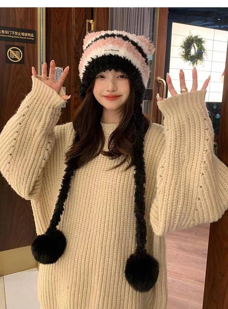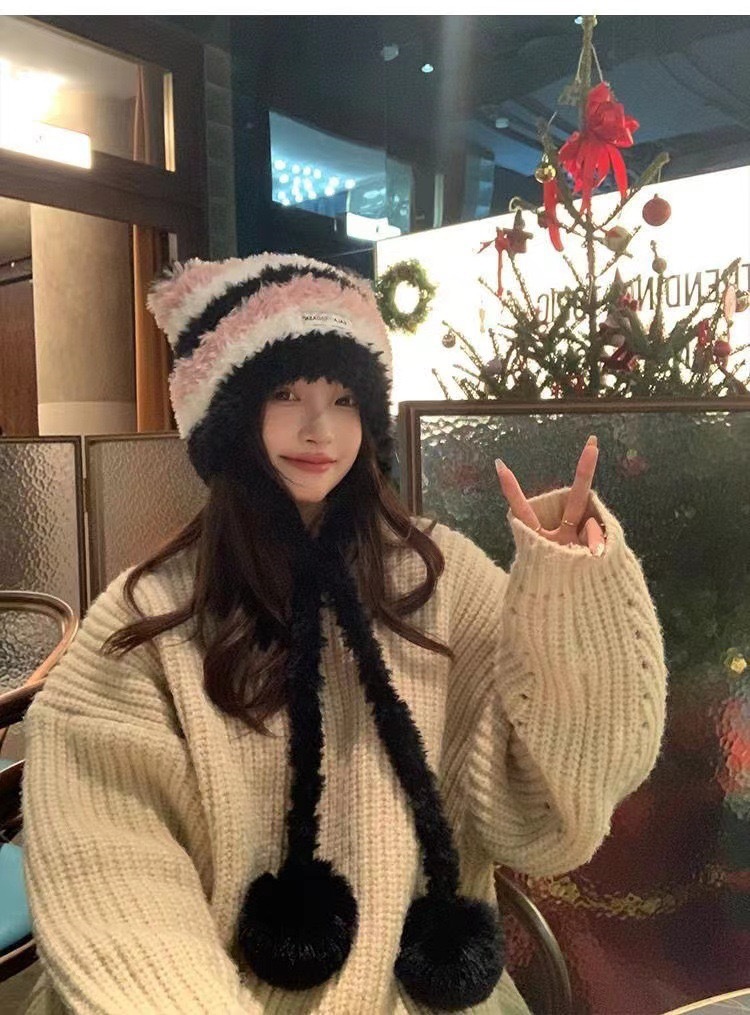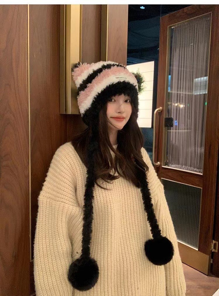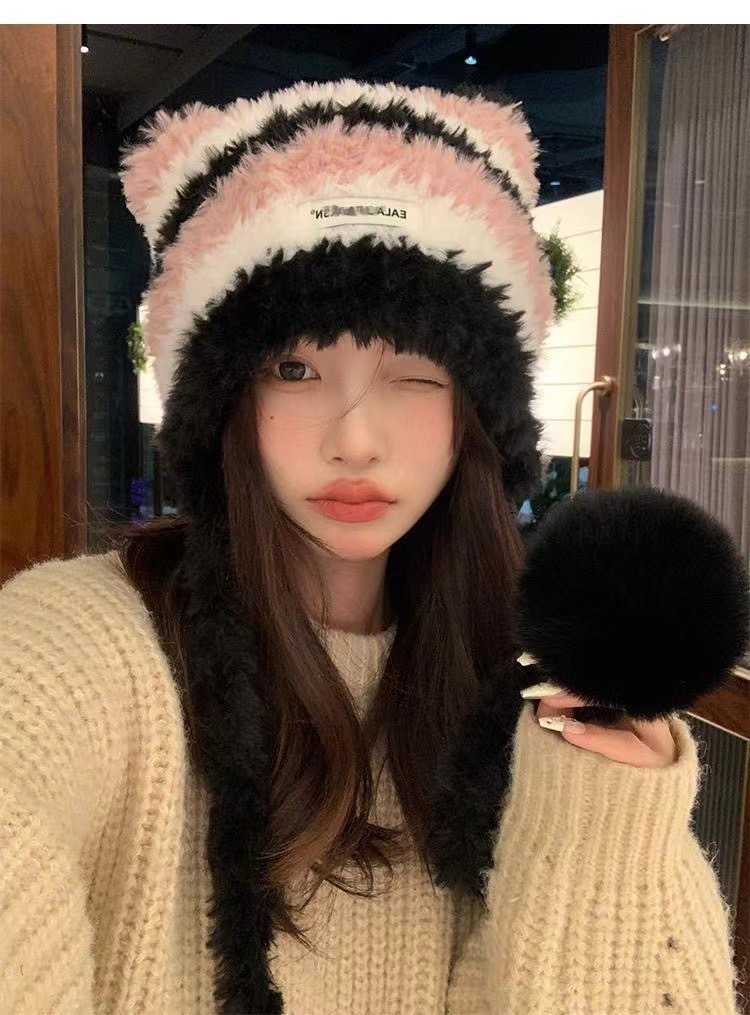 新しい冬のカラーブロックストライプのぬいぐるみ帽子、耳当て付き帽子、ファッショナブルで多用途、キュートで暖かい帽子、ニット帽、女性用、大人用