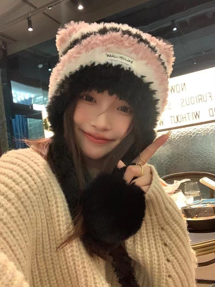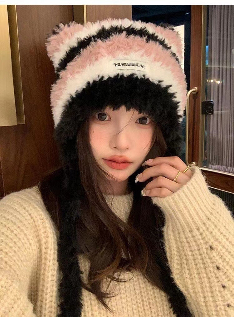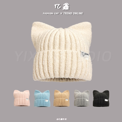 秋冬新款甜美可爱猫耳针织帽子女冬季韩版套头毛线帽百搭加绒保暖