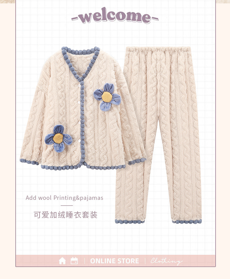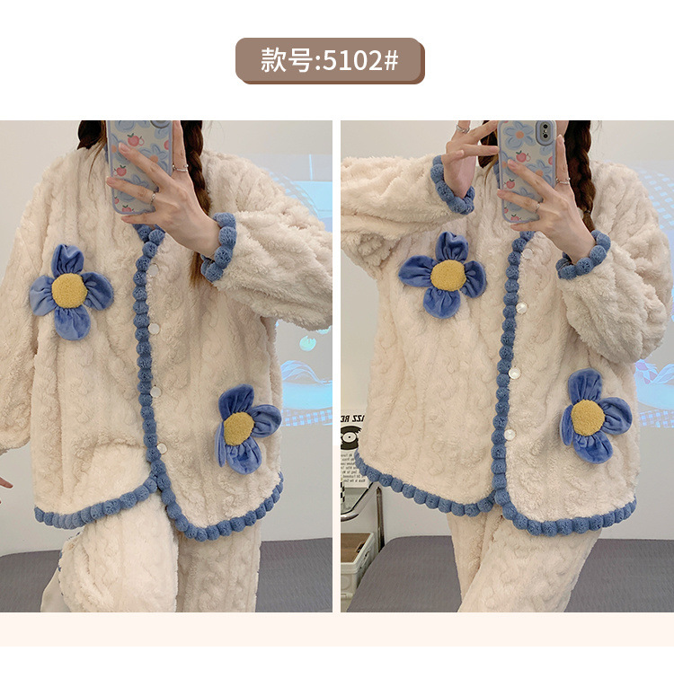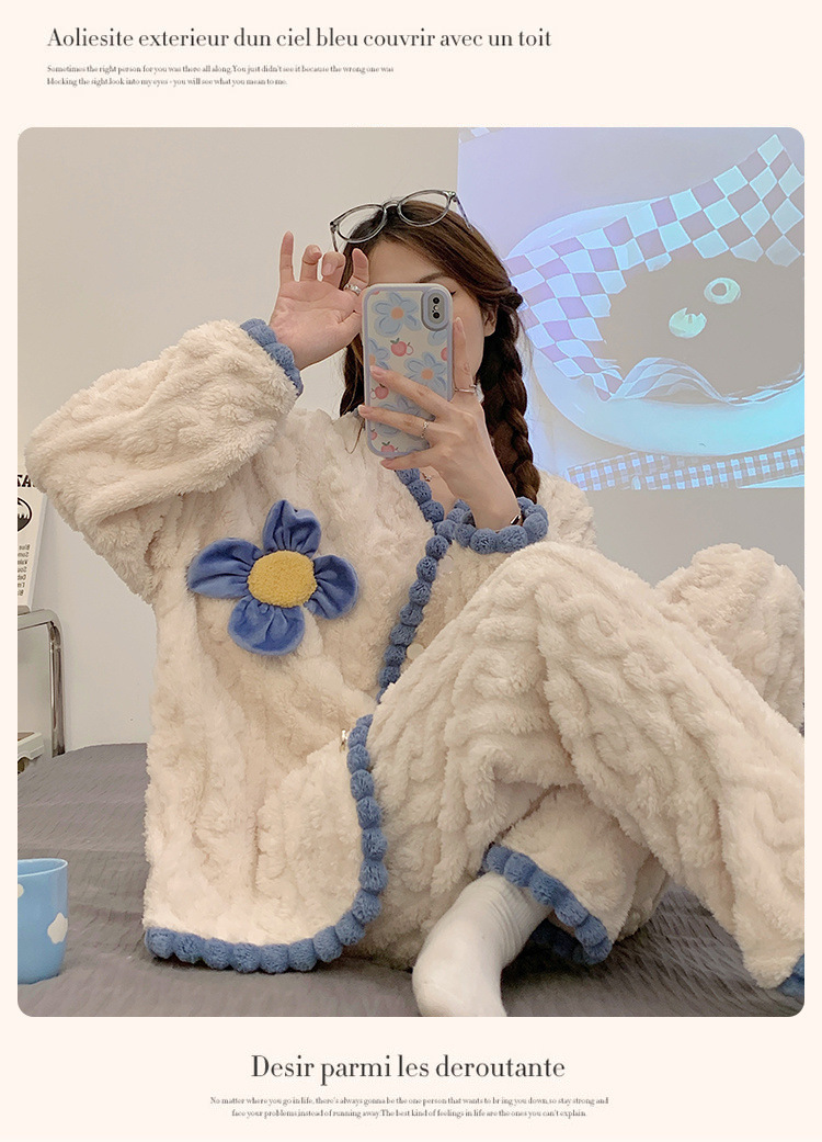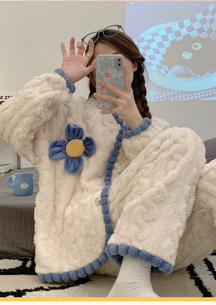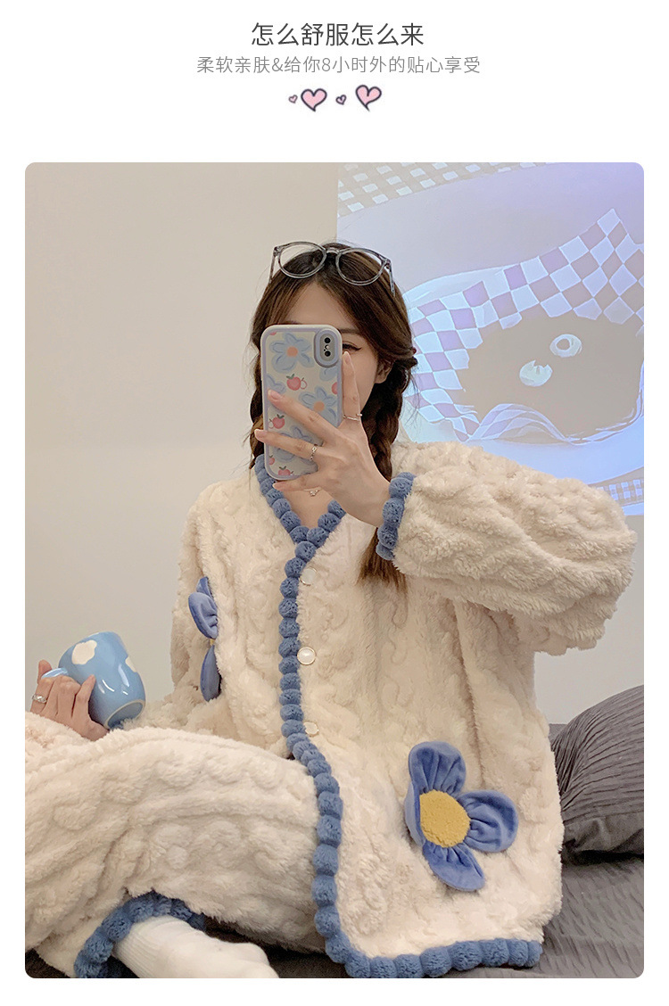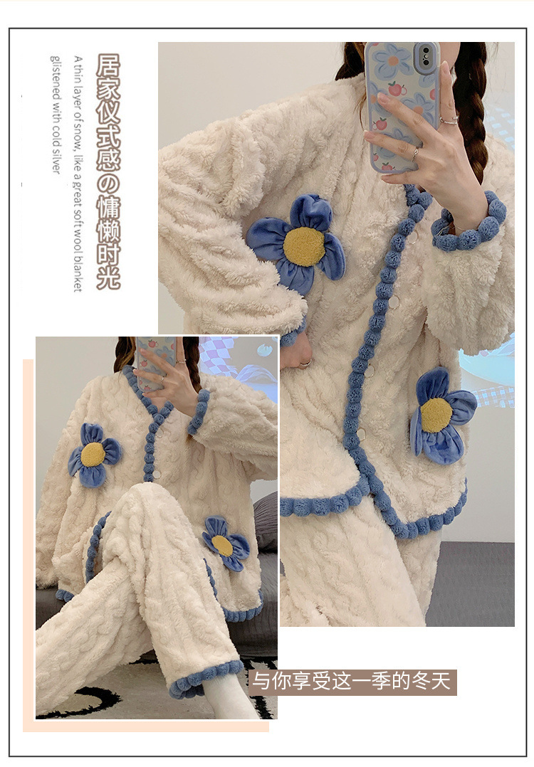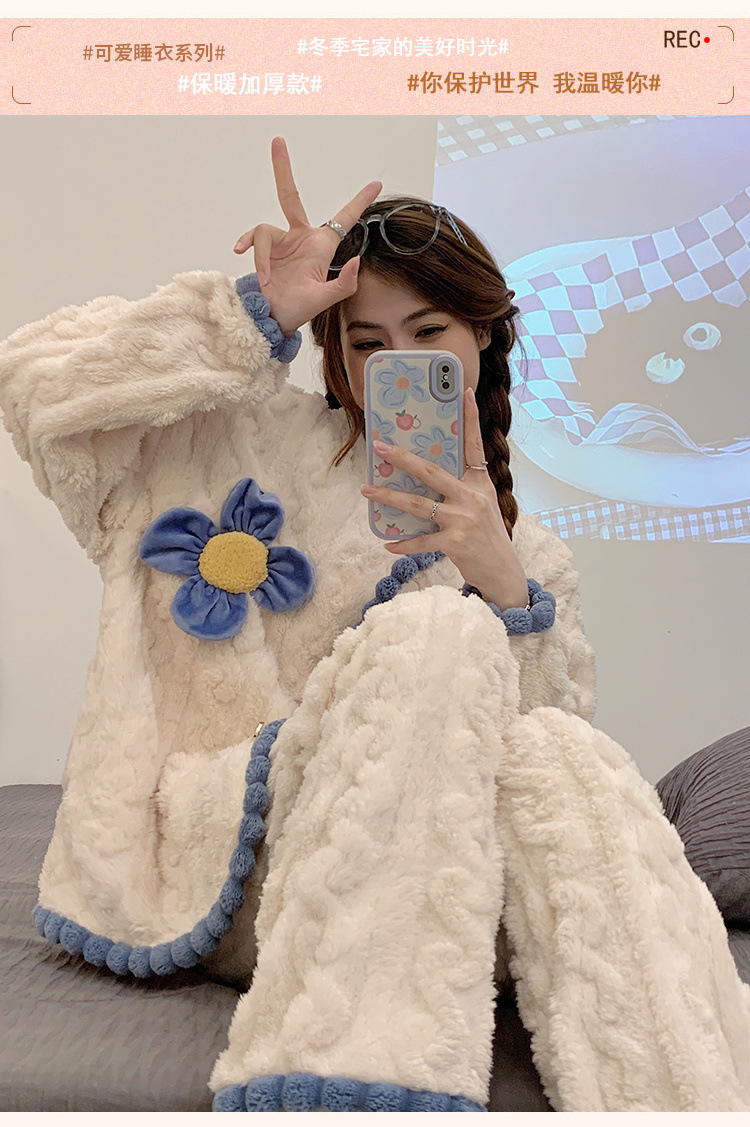珊瑚绒睡衣女冬季加绒加厚甜美花朵2025新款春秋法兰绒家居服套装