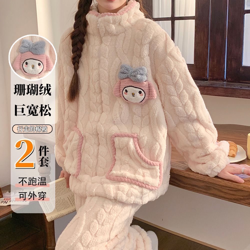 冬季新款甜美睡衣女法兰绒拉链加绒加厚保暖可爱可外穿家居服套装