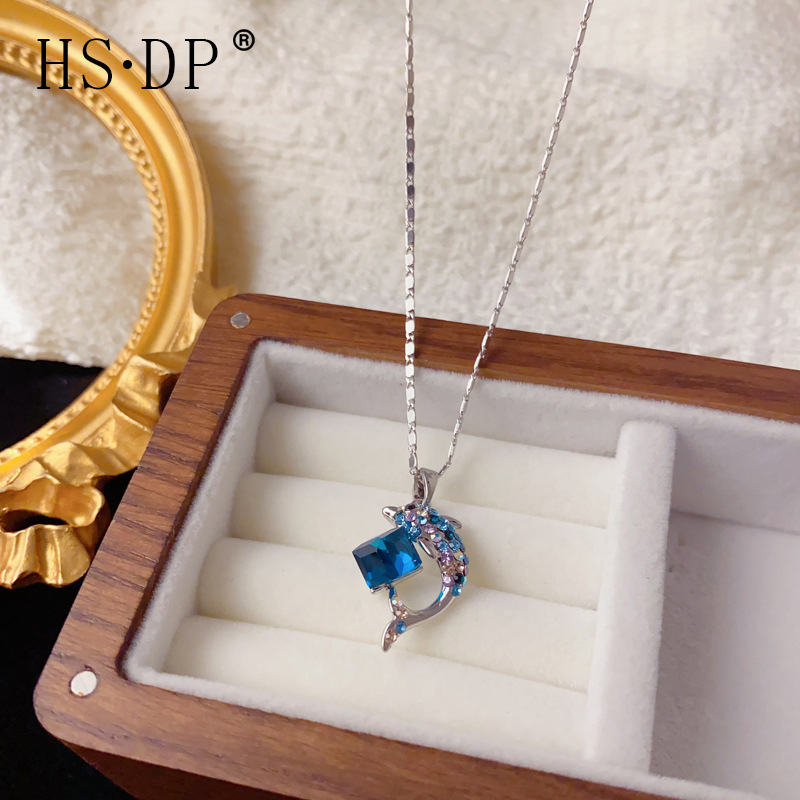 日韩甜美简约卡通百搭蓝色方钻海豚吊坠项链个性轻奢设计感锁骨链