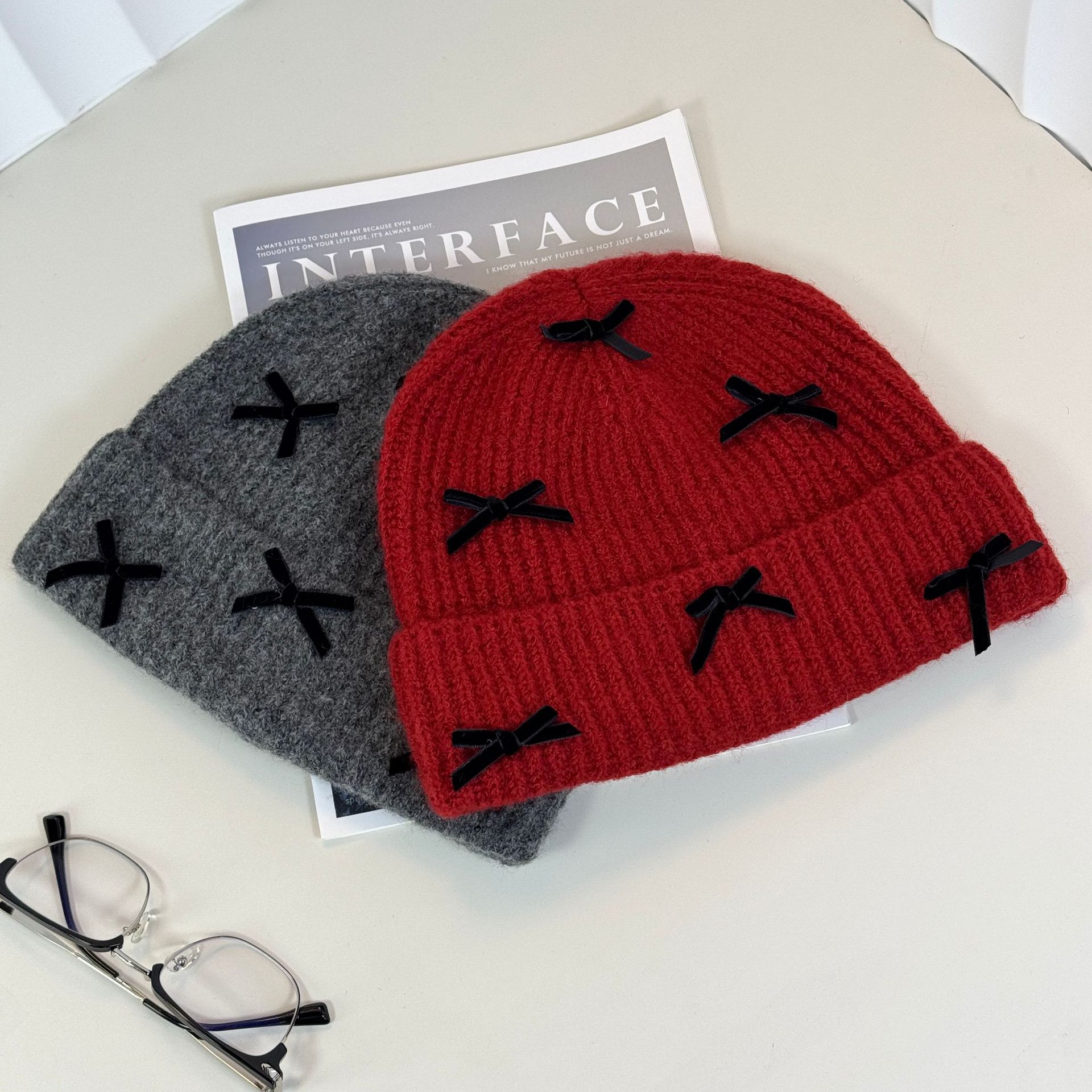 2024蝶結び純色ニット帽子供秋冬ウール混紡保温毛糸帽子耳保護冷帽子韓国風