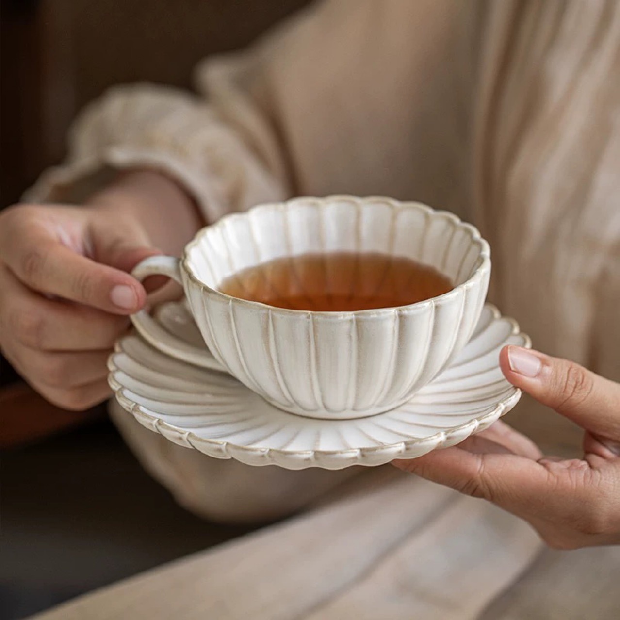 花びら花型コーヒーカップ皿セット窯変陶磁器釉薬下彩午後茶カップ皿家庭用花カップ高颜値