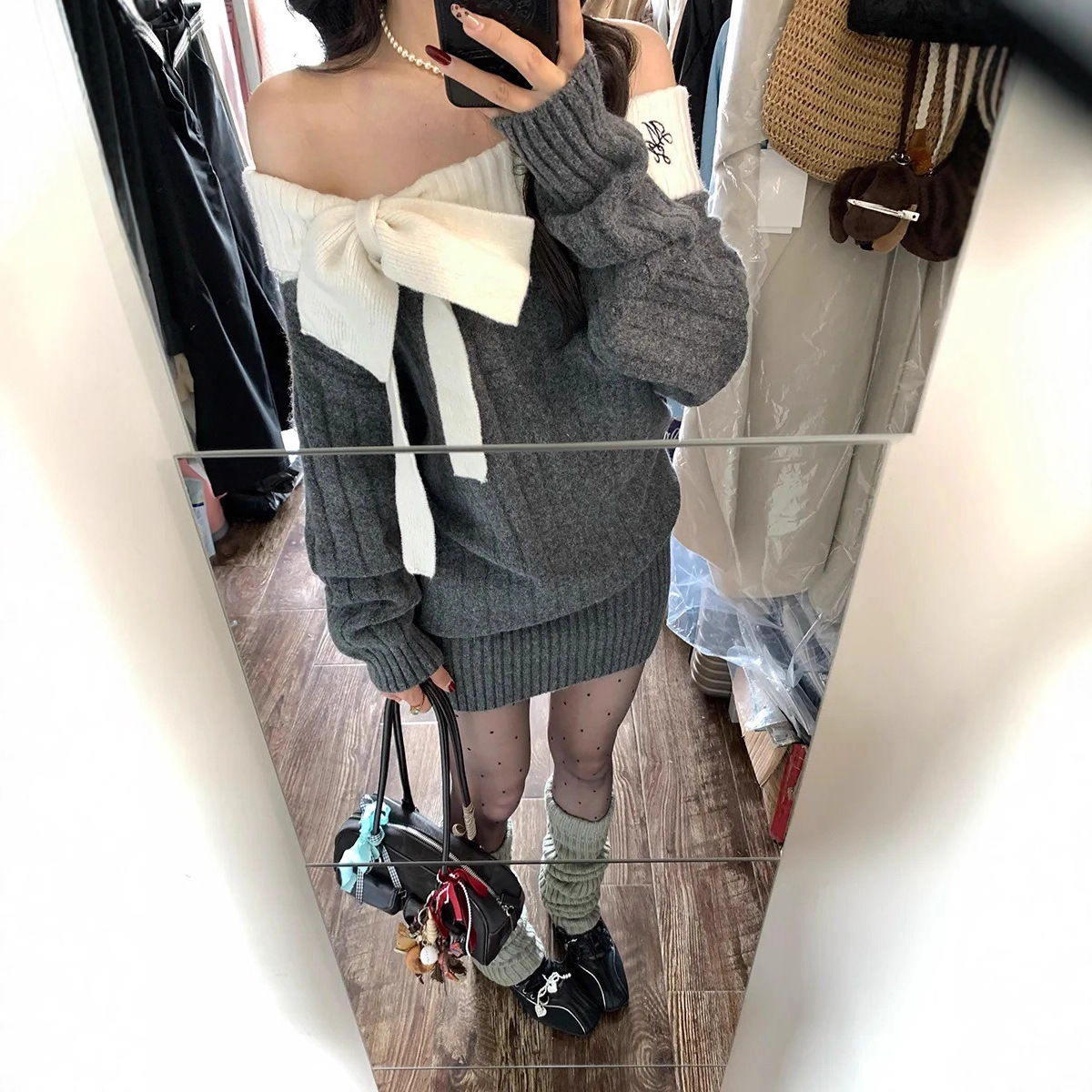 韩系纯欲风蝴蝶结一字肩针织连衣裙女秋季收腰显瘦气质包臀短裙子