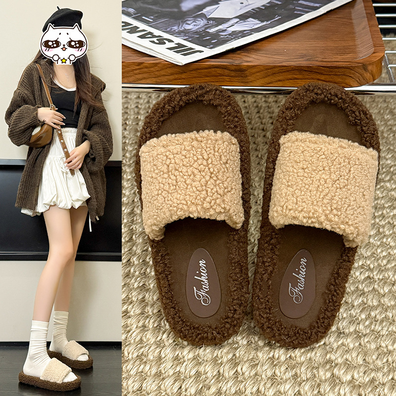 家居厚底毛毛拖鞋女外穿秋冬新款韩版温柔仙女一字带平底加绒棉鞋