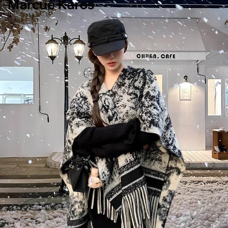 秋冬仿羊绒水墨画披肩女士保暖针织围巾披风民族风斗篷民族风披肩