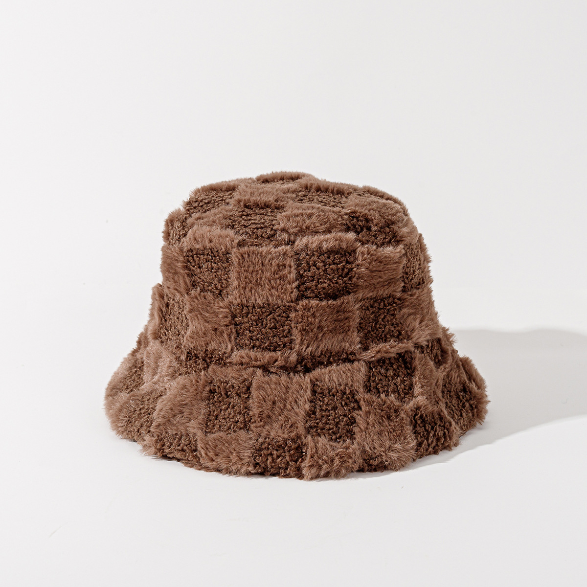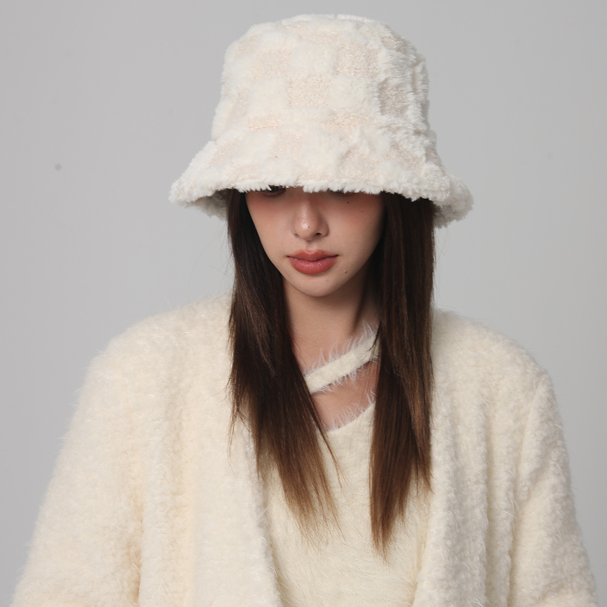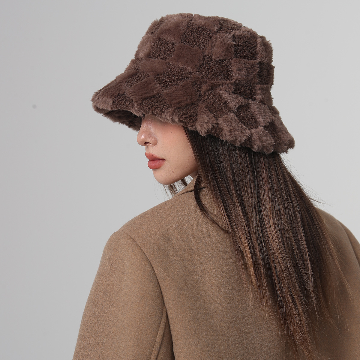 棋盘格渔夫帽秋冬季新款男女百搭日系保暖帽子毛绒韩版大头围盆帽