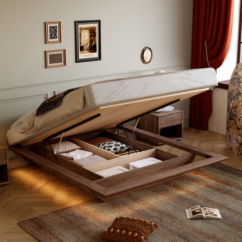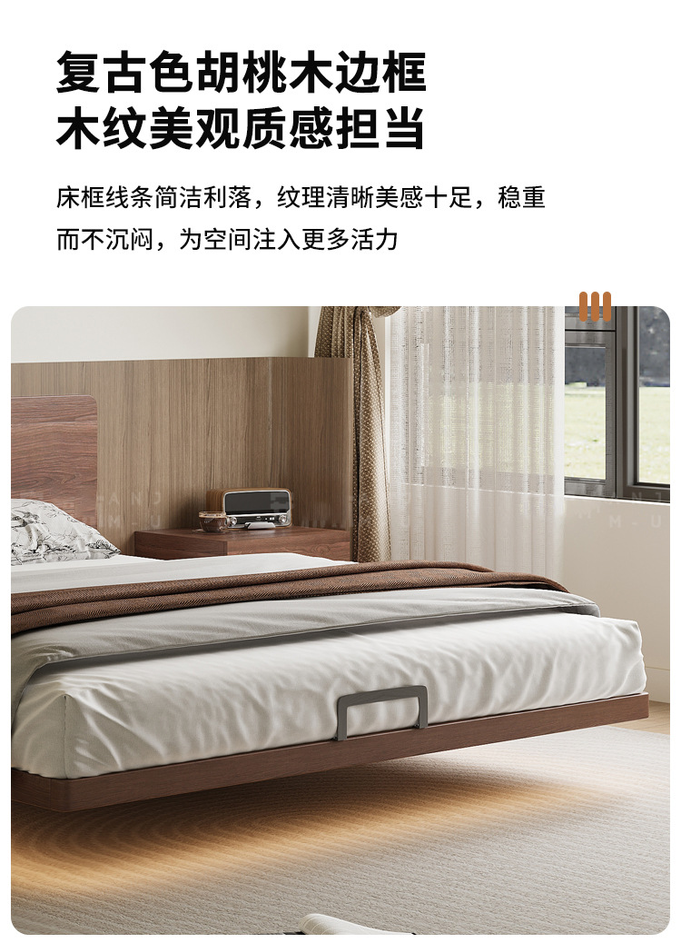 胡桃木全实木齐边悬浮无床头储物床现代简约榻榻米气压高箱收纳床