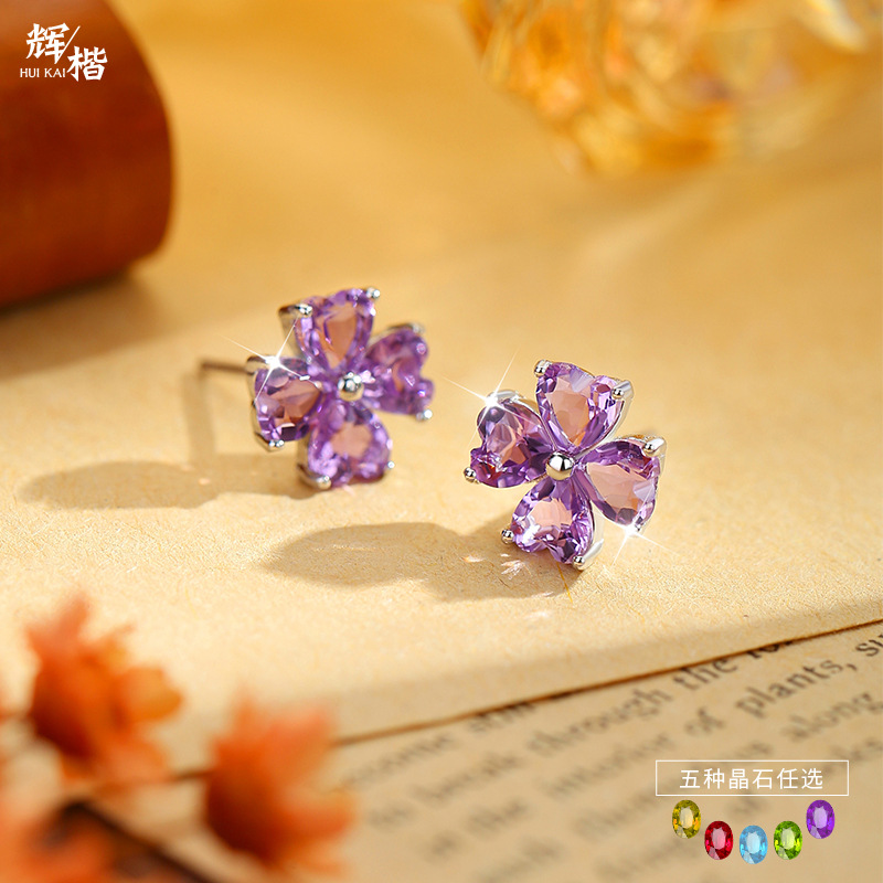 高档S925纯银耳钉女日韩风森系高级感天然石四叶草心形水晶石耳饰