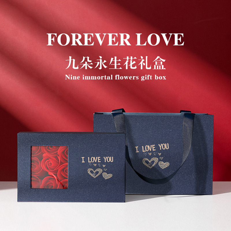 永遠の花ギフトボックス,オリジナル証明書,カスタマイズされた彫刻サービス,永遠の花9本セット,ブルーのサテンギフトボックス,グリーンリボンギフトボックス-ギフトバッグ
