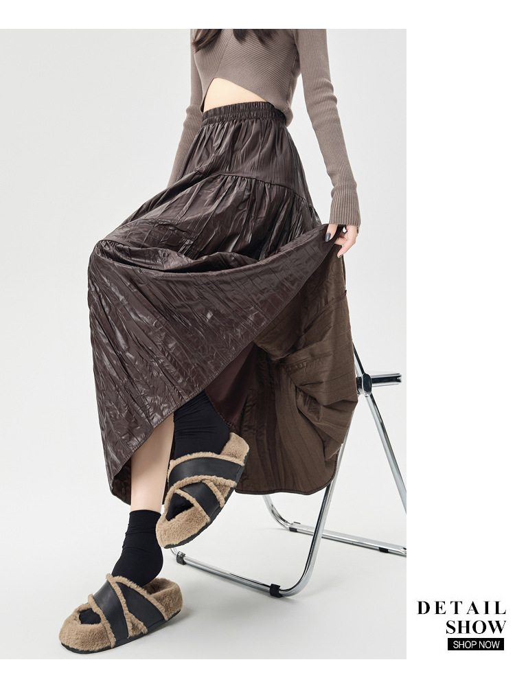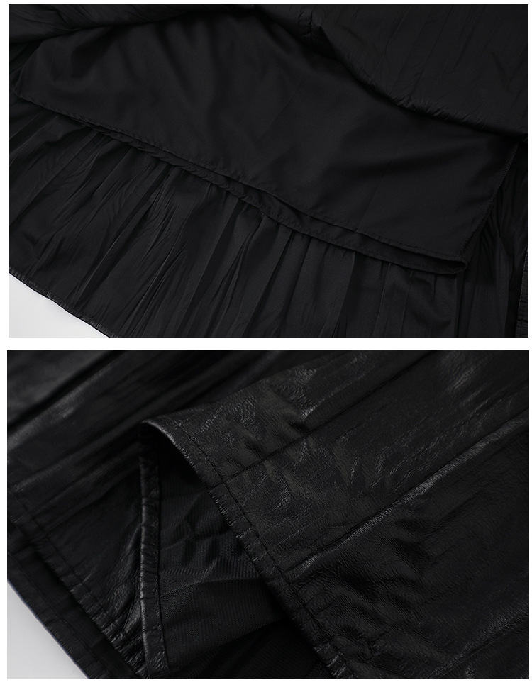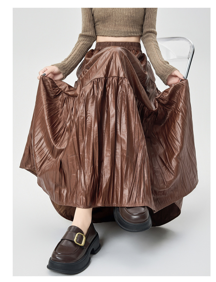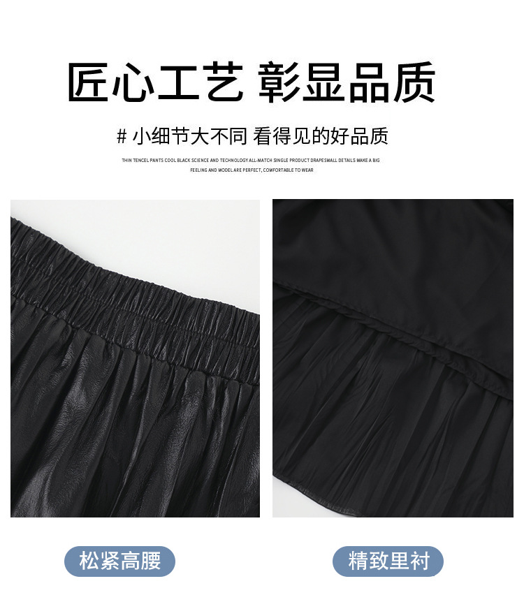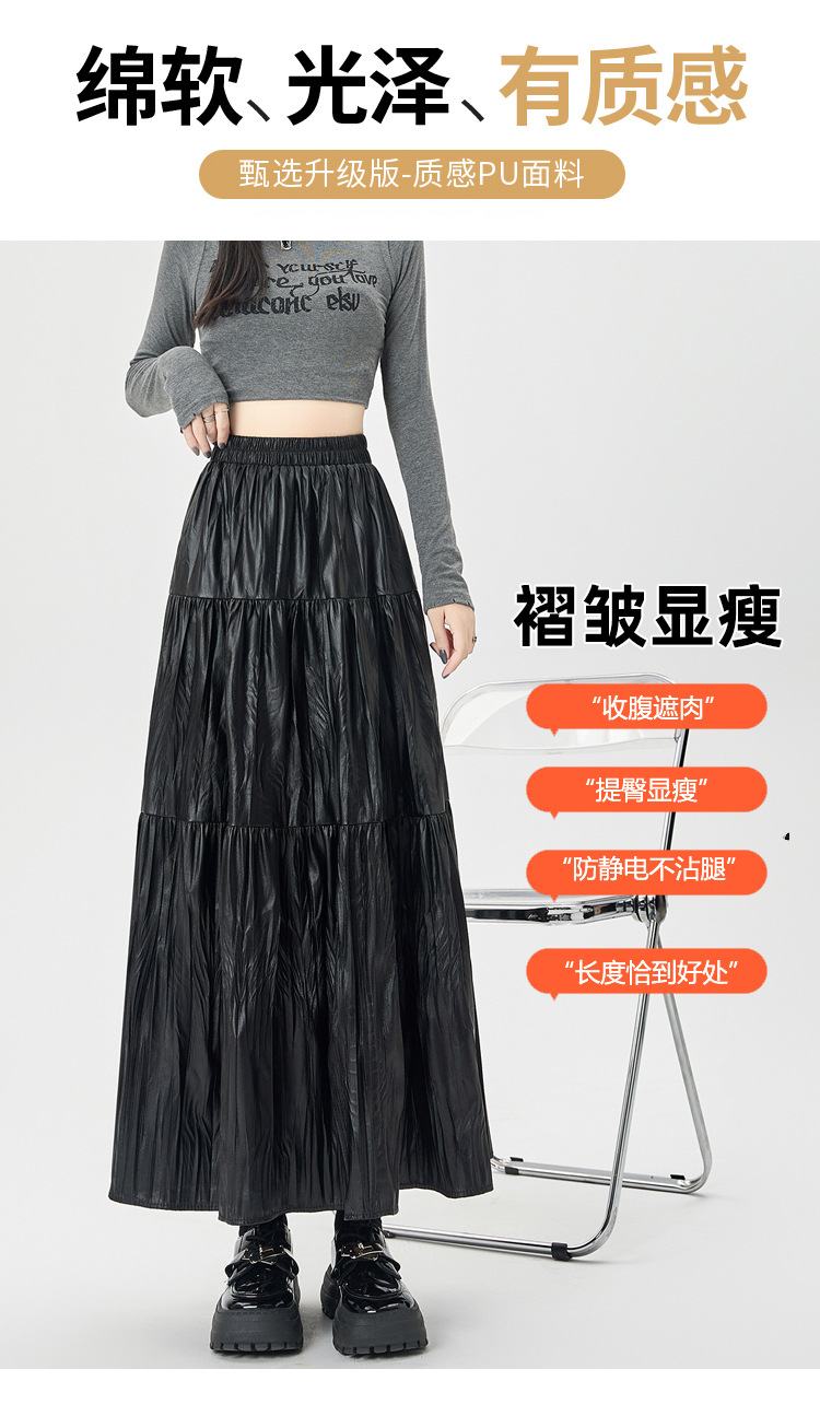肌理感褶皱半身裙女PU皮裙秋洋气时尚高腰宽松显瘦大摆拼接A字裙