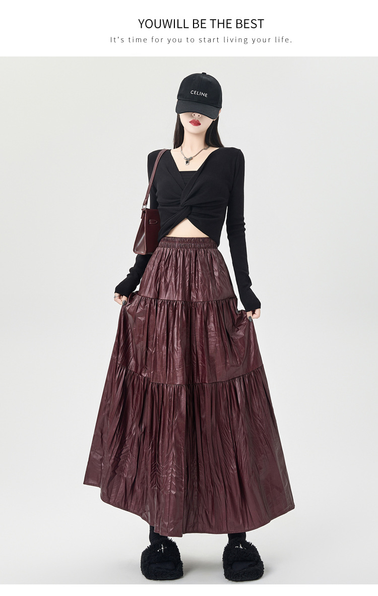 菲媛复古安可拉红褶皱拼接半身裙女 秋冬新款高腰显瘦大摆PU皮裙
