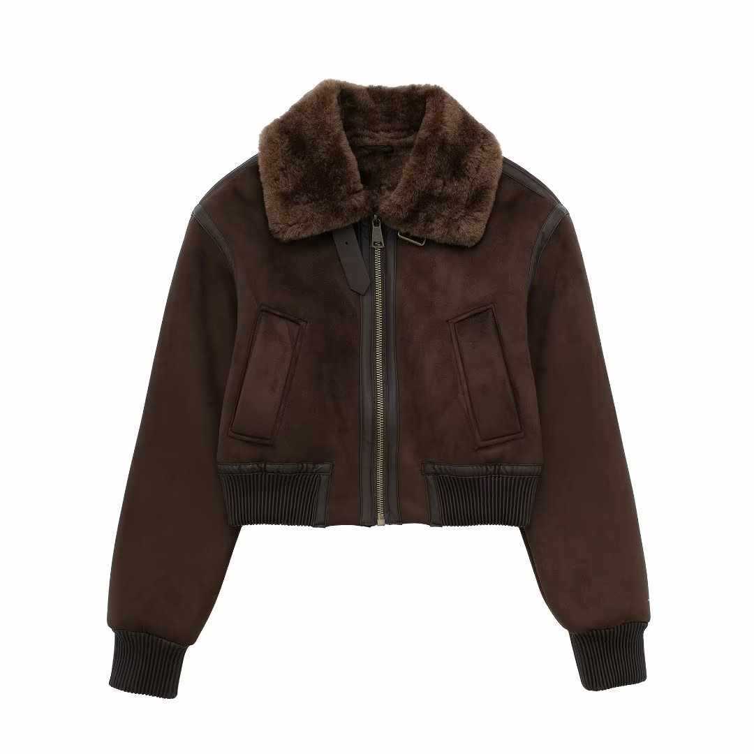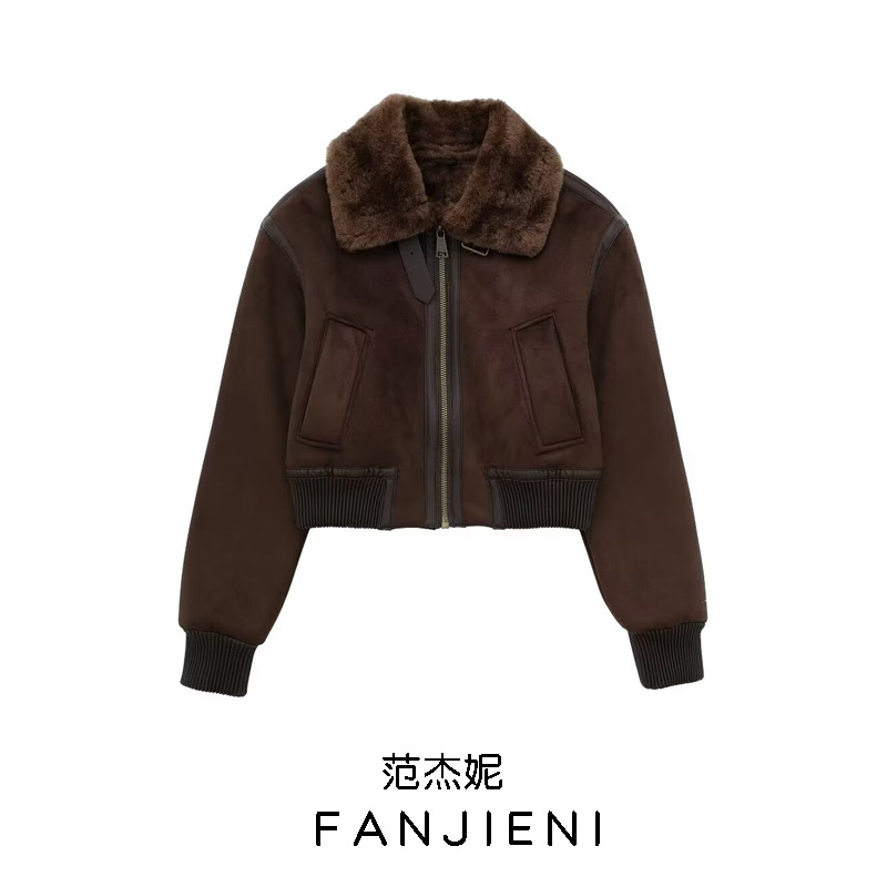 ZA速卖通爆款跨境外贸欧美风女装反绒皮效果可拆领口夹克外套