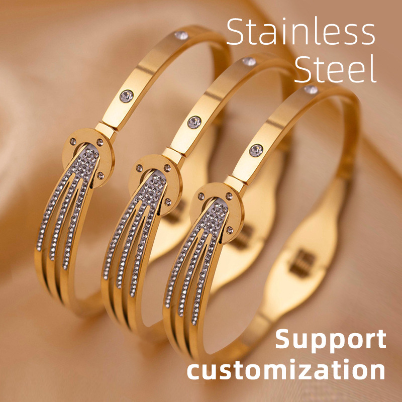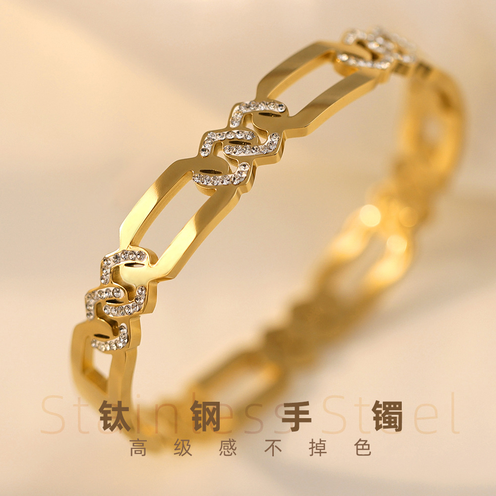 厂家直销跨境批发18k金高级感镶钻女钛钢不掉色饰品 钛钢手镯