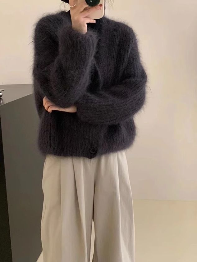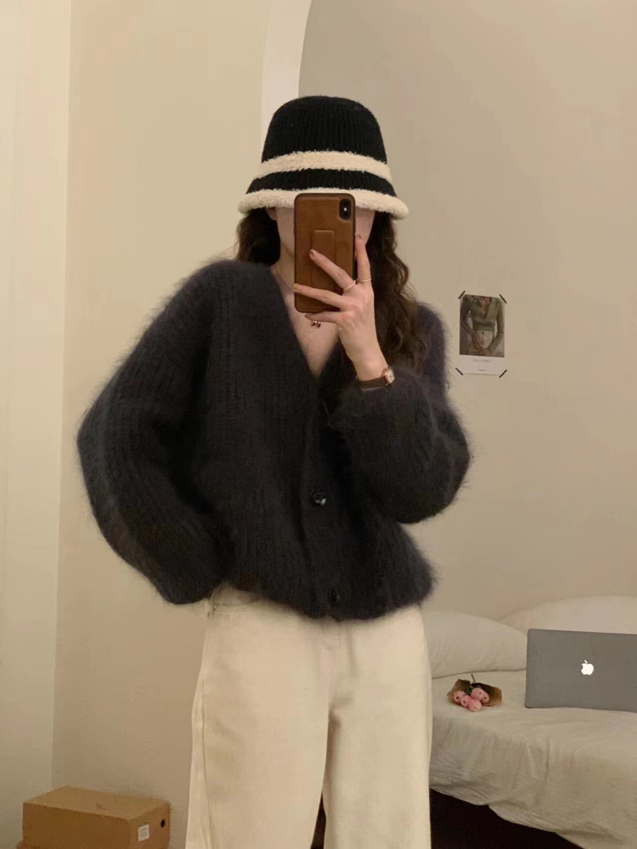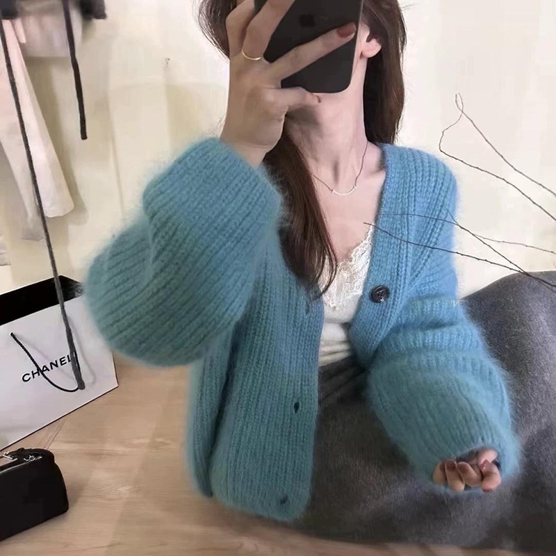 松弛感v领软糯蓝色毛衣秋冬季宽松外穿仿水貂绒毛毛针织开衫外套