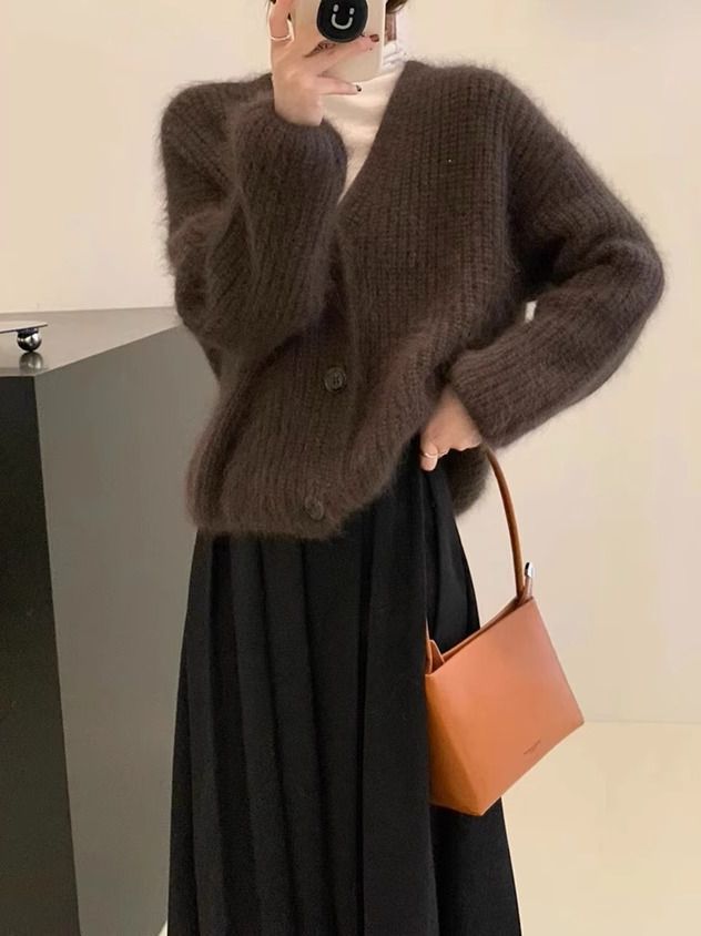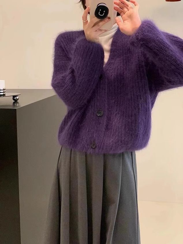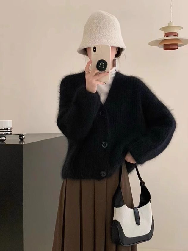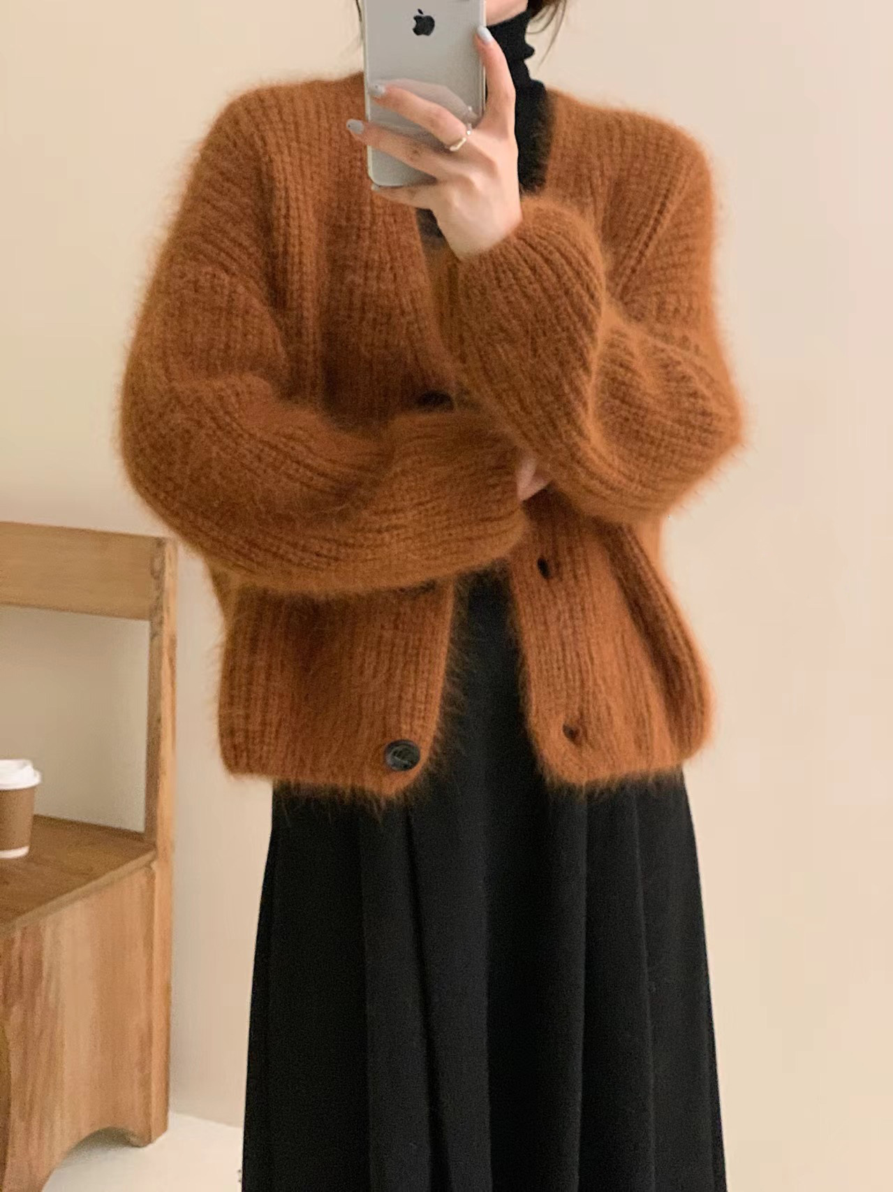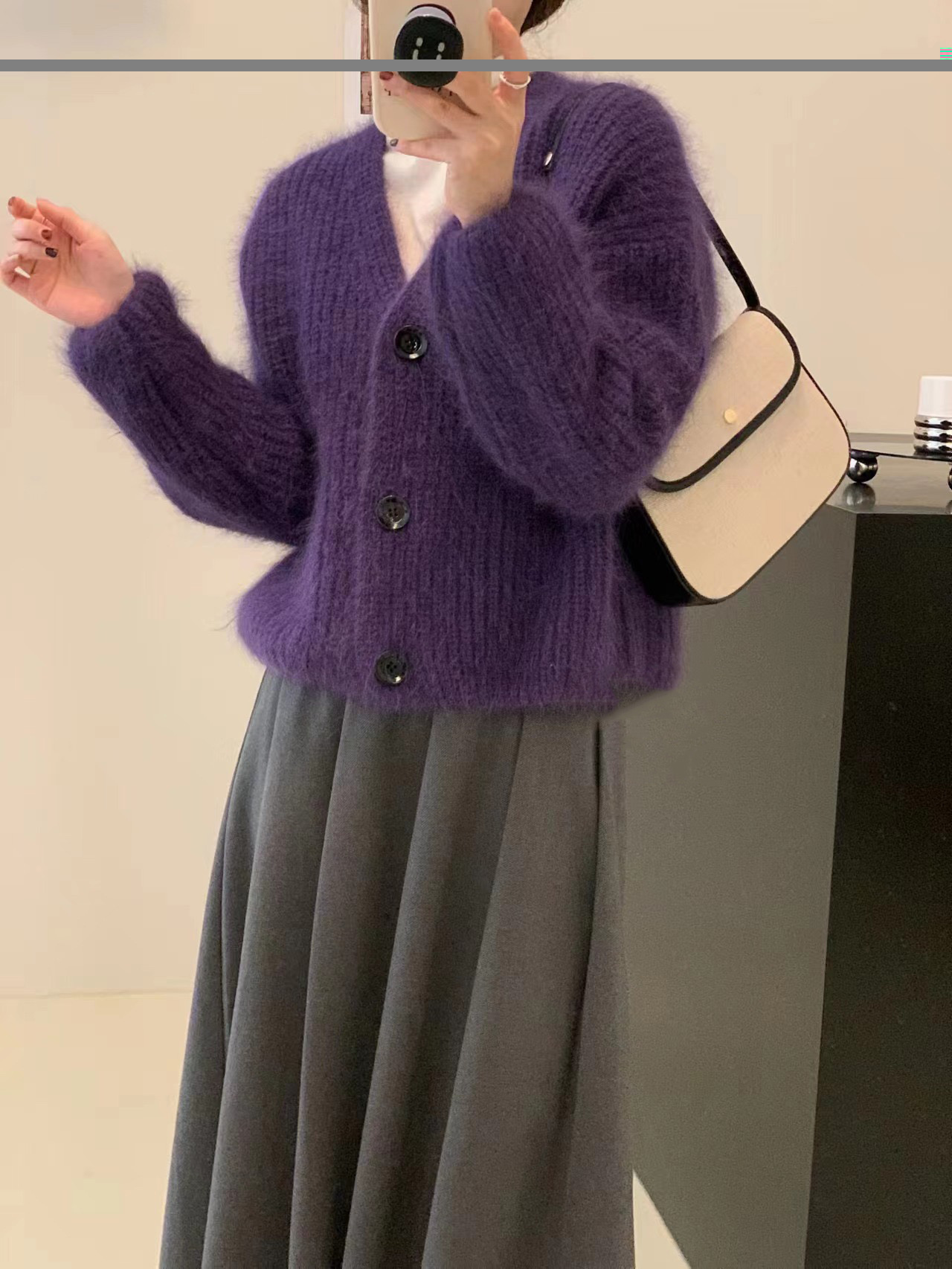 日系温柔风v领长袖毛衣外套软糯仿貂绒针织开衫通勤休闲短款上衣
