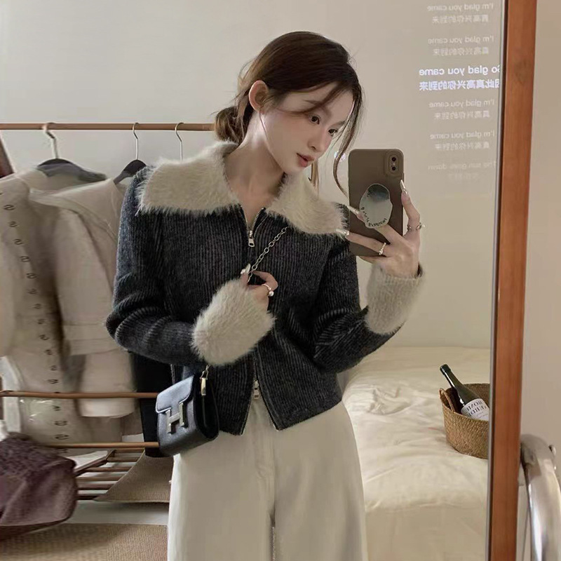 ダブルファスナーの襟をめくったミンクの袖口はセーターのコートをつなぎ合わせます。