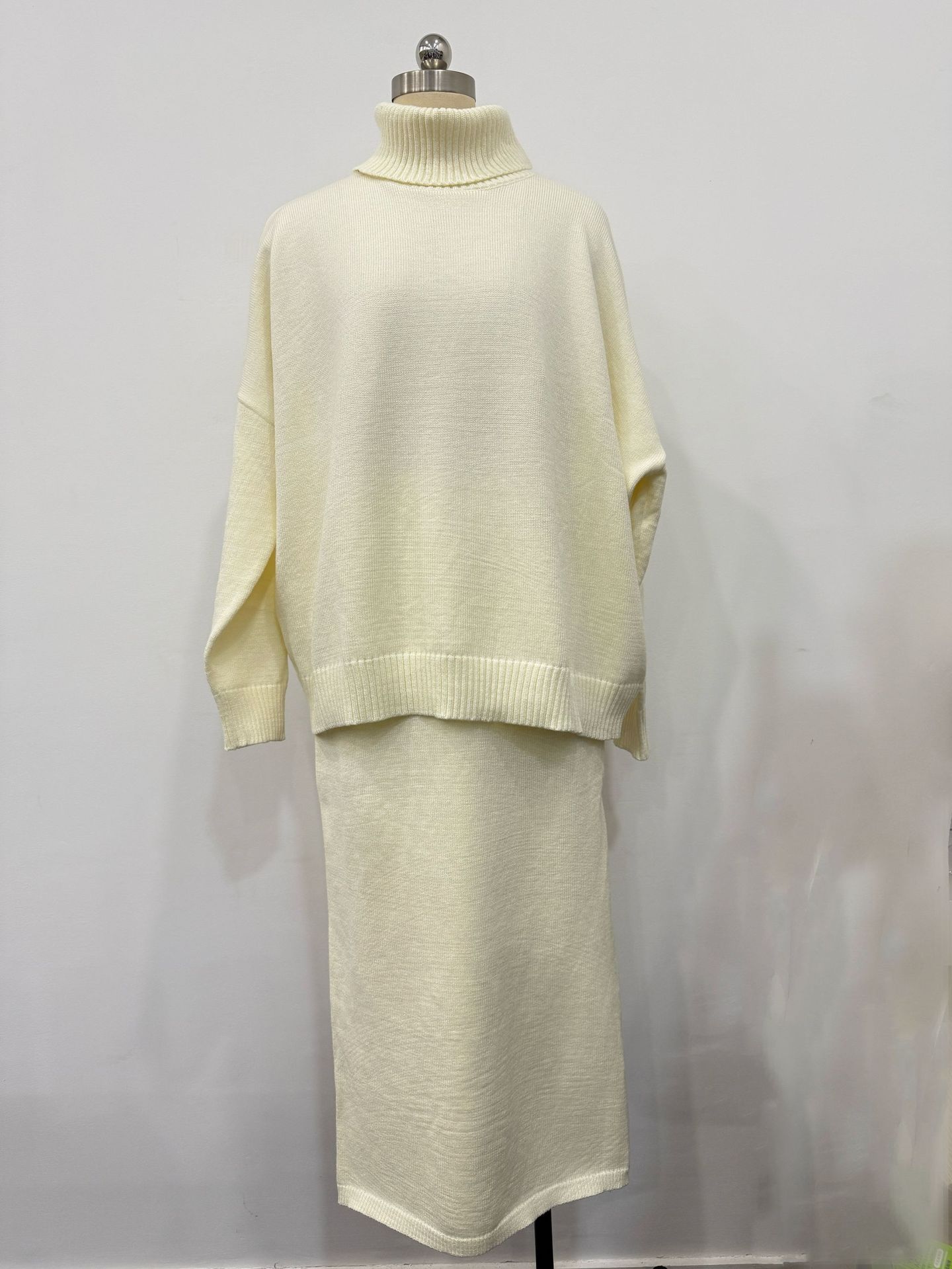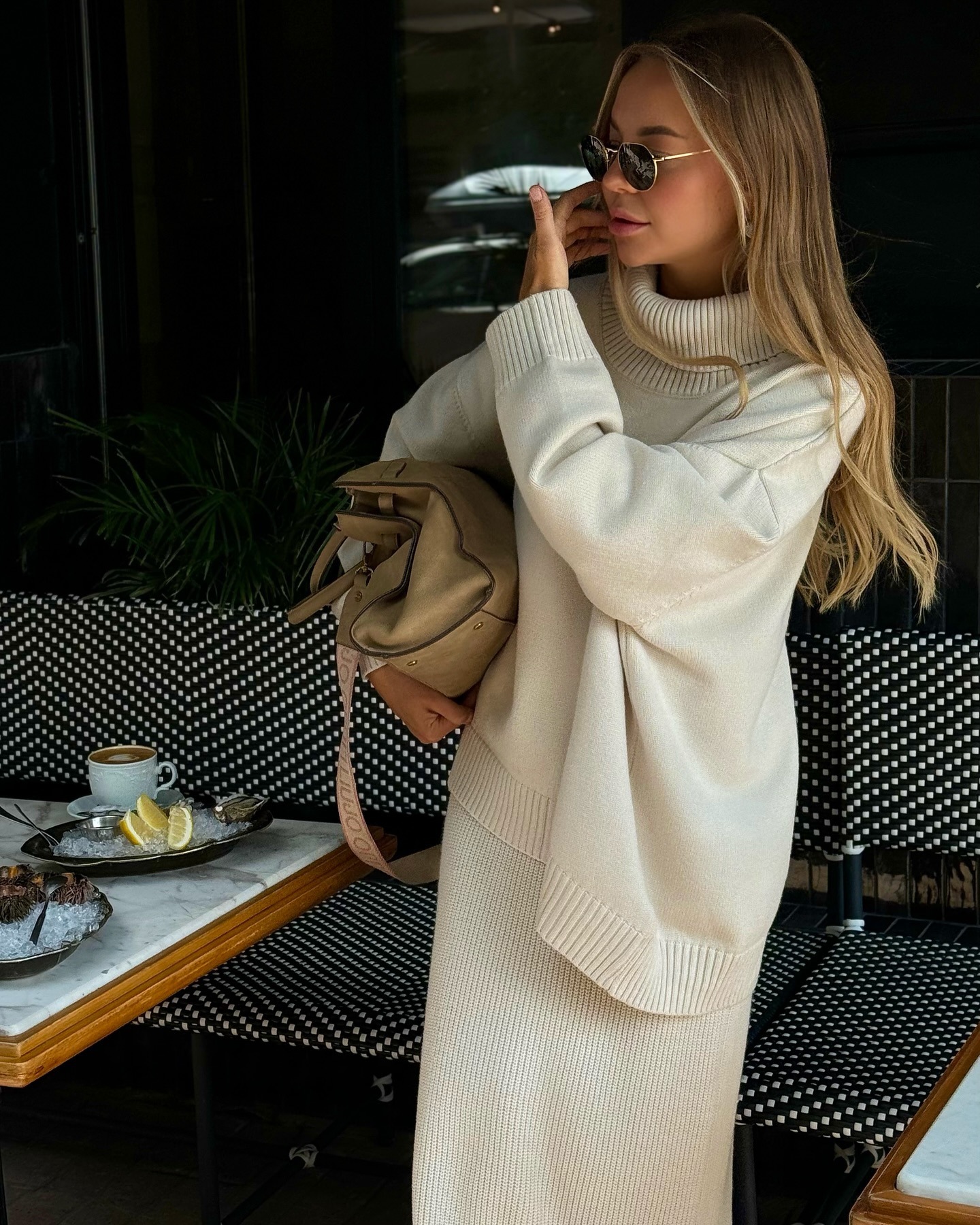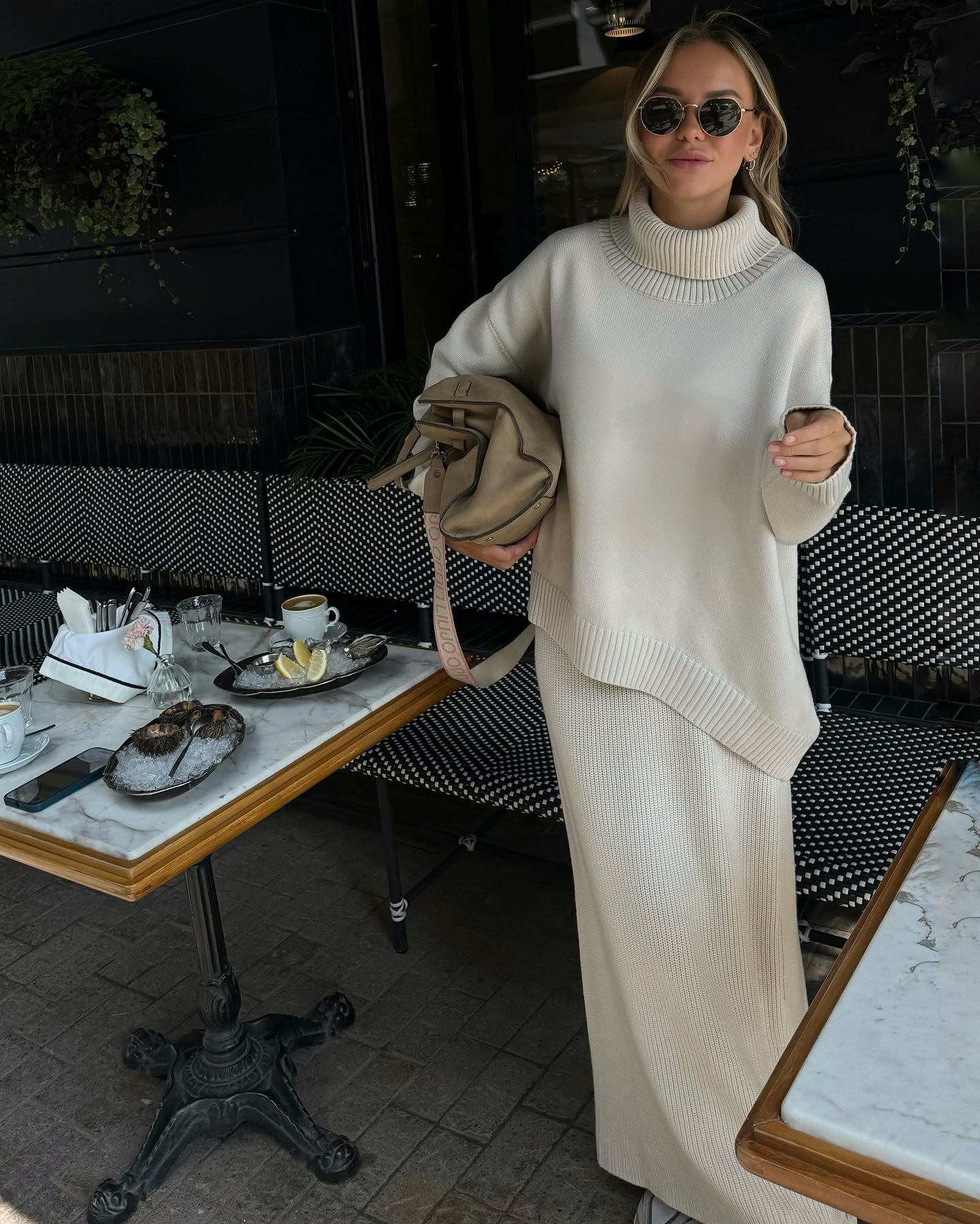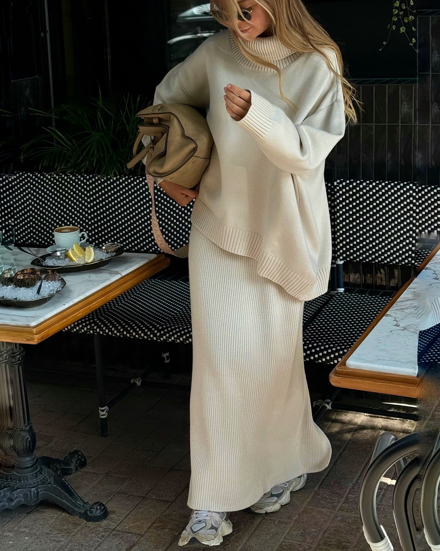 名称;法式毛织套装两件套秋冬高领长袖慵懒风垂感毛衣直筒宽松半身裙女