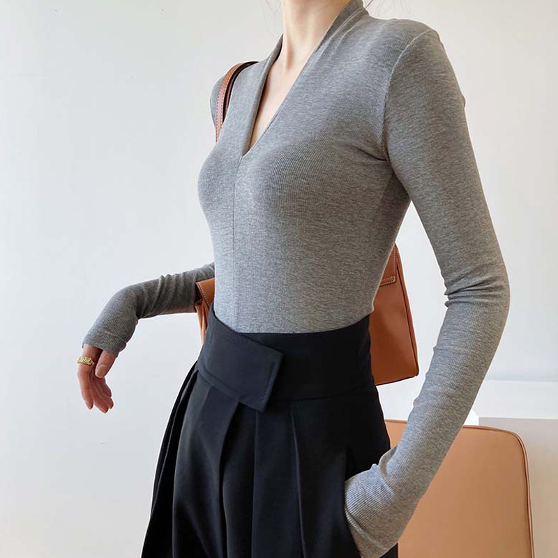 秋の女性用長袖Tシャツ、Vネック、タイトフィット無地ボトムシャツ、ネットセレブガールズイン超人気トップス、スリムフィット
