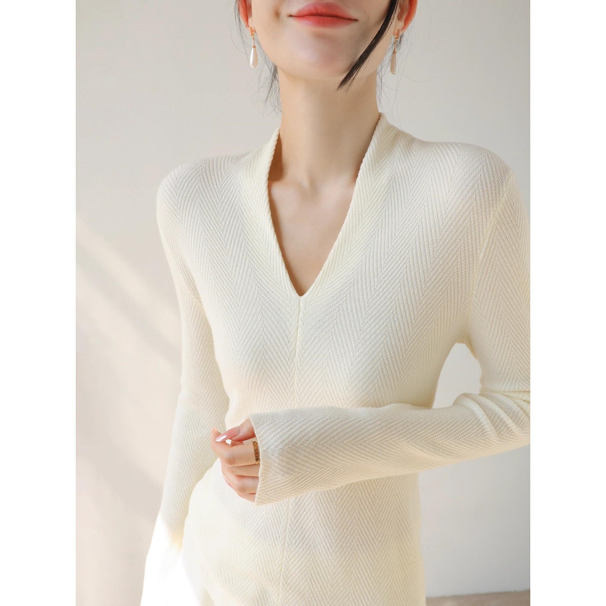 设计感V领水波纹修身针织羊毛女秋长袖内搭外穿打底衫毛衣杏色