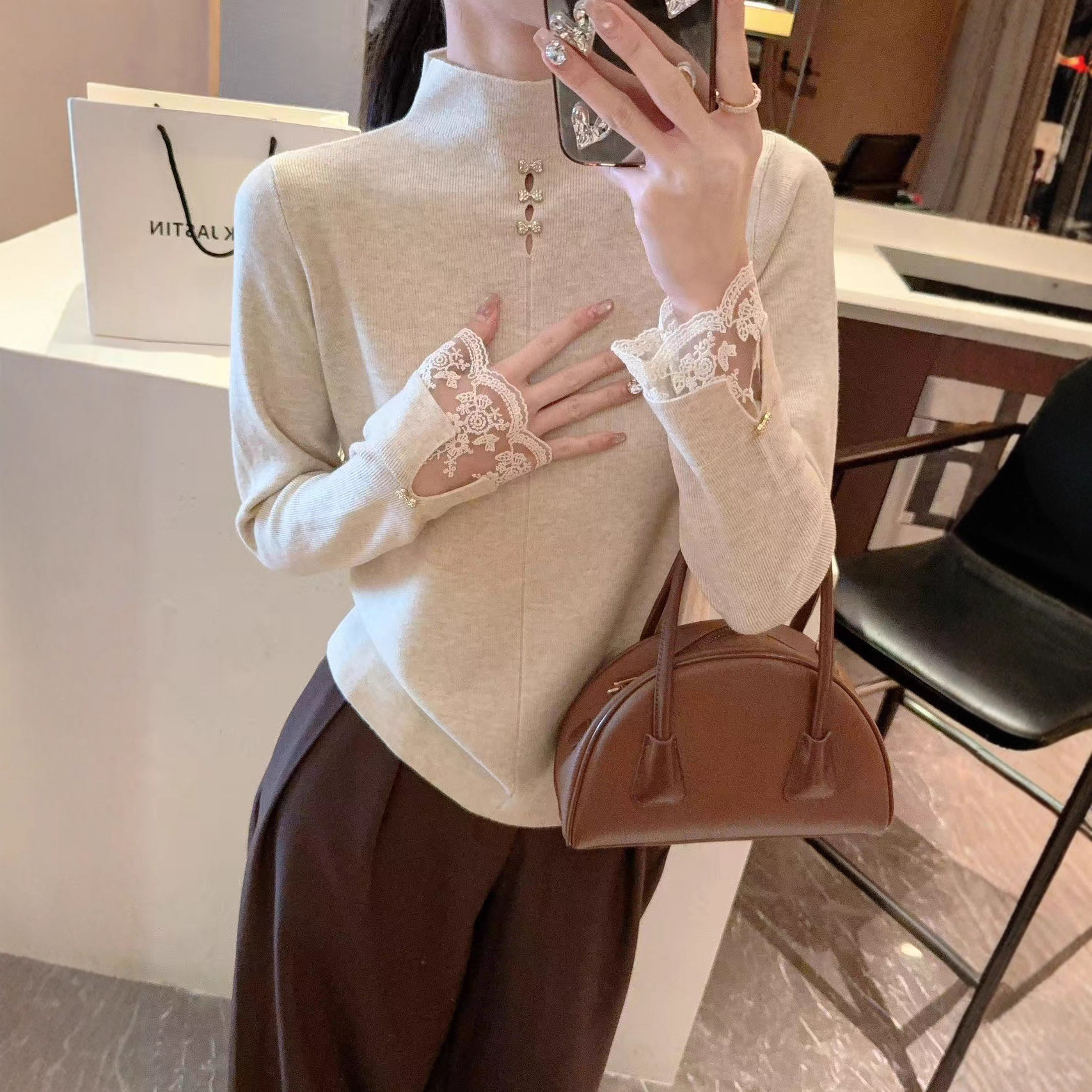 2025秋季新款时尚设计感高领长袖打底衫修身显瘦拼接蕾丝女装上衣