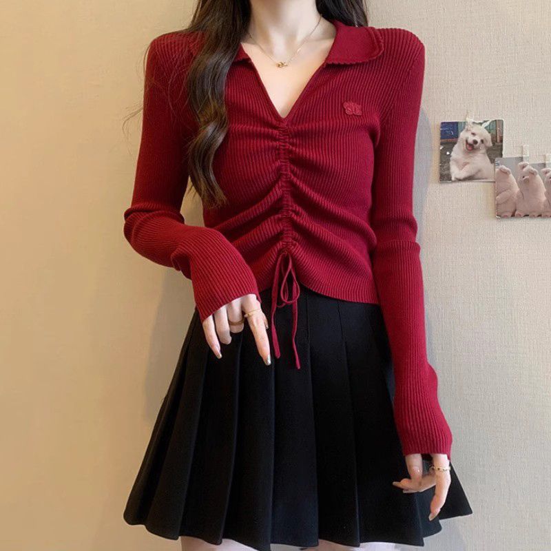秋冬新款翻领气质褶皱独特安哥拉红上衣韩系chic法式长袖打底衫女