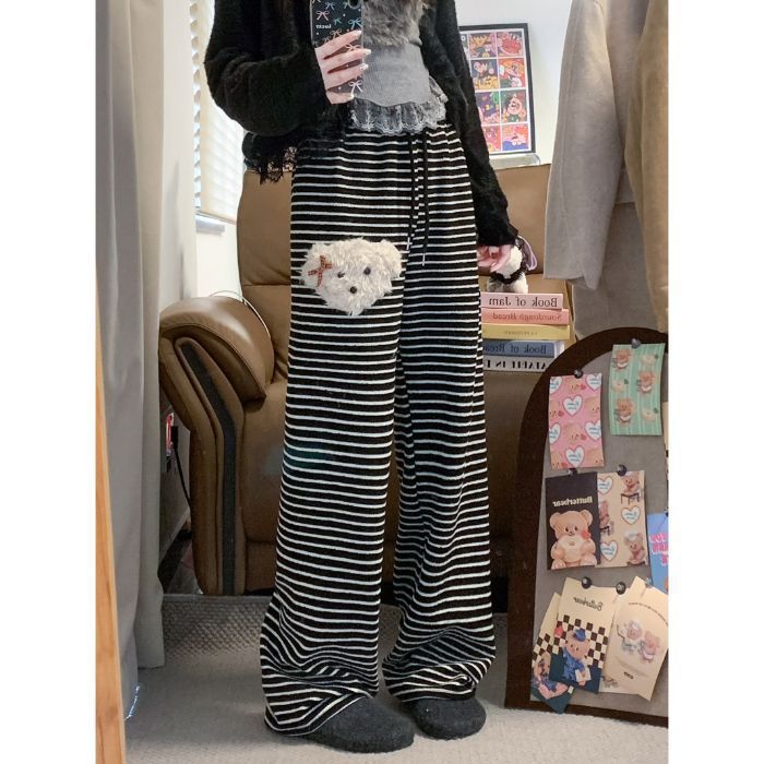 加绒加厚毛绒小狗条纹休闲裤女秋冬季新款高腰显瘦百搭阔腿裤长裤