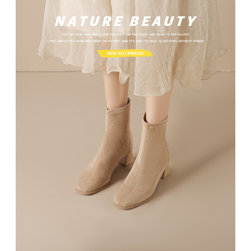 7cmサイズ、31-40サイズ、ポインテッドトゥハイヒールミドルブーツ、スエードスリムブーツ、身長アップ、バックジッパー、チャンキーヒールショートブーツ、女性用